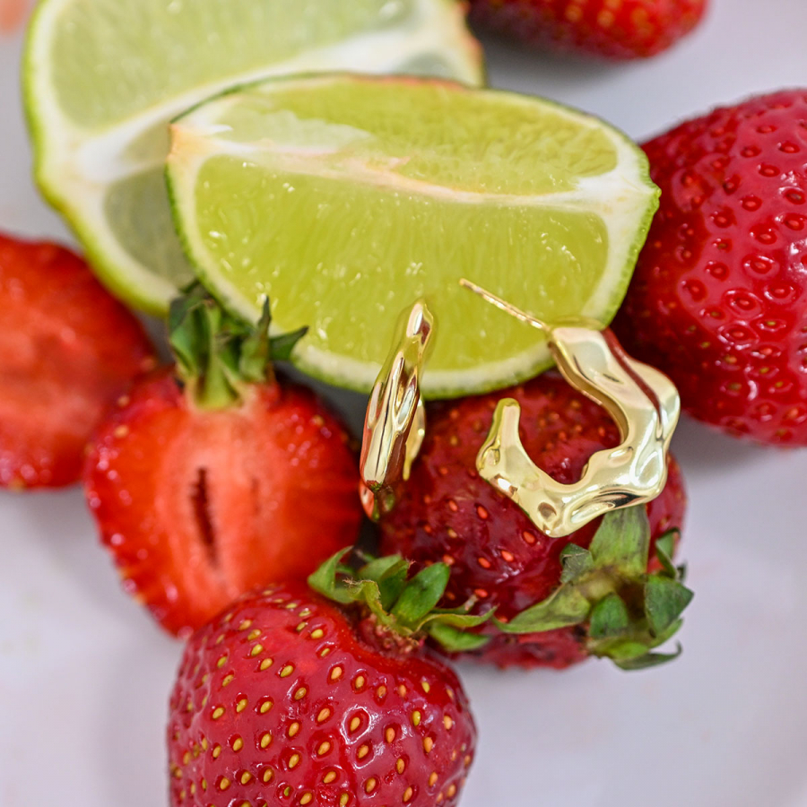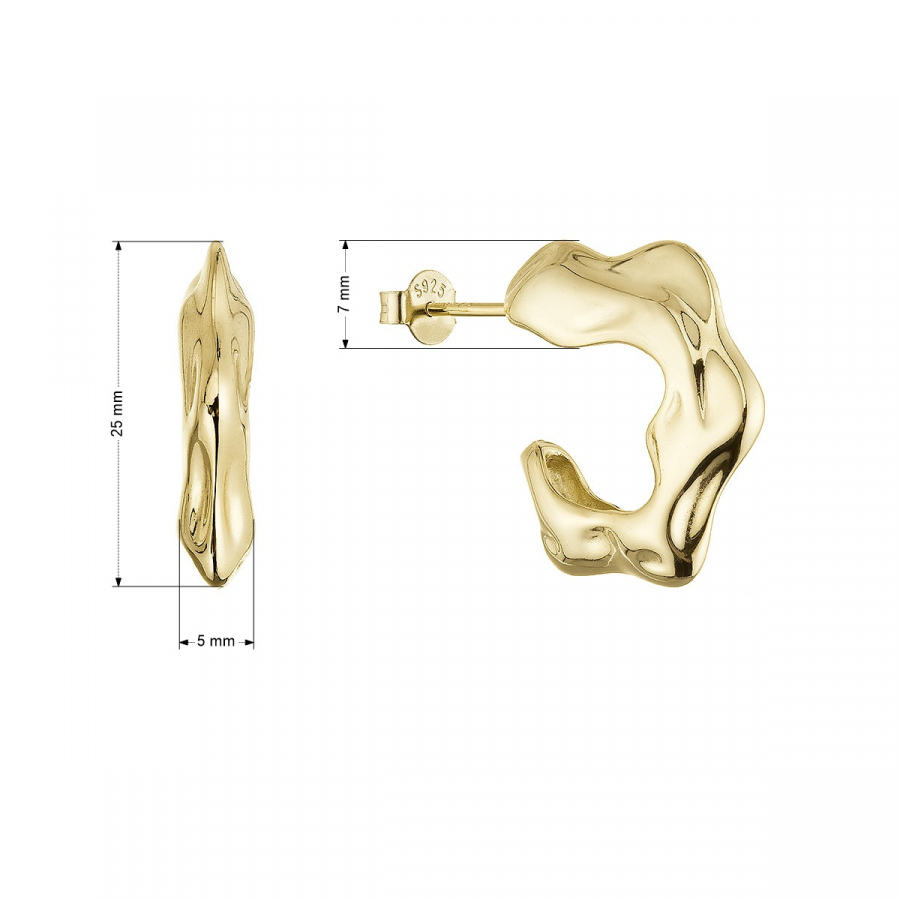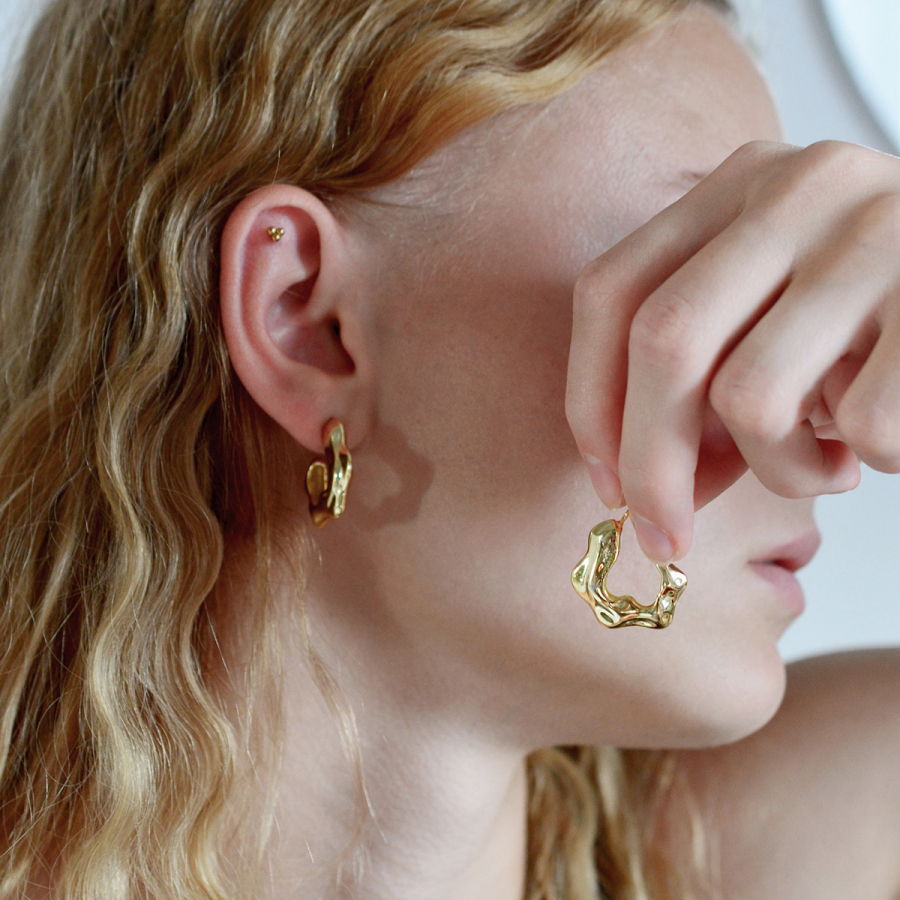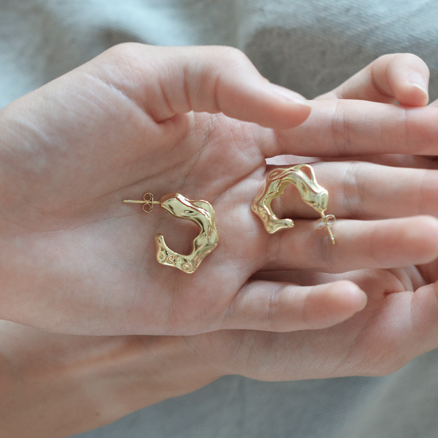 Výrazné náušnice v tvare otvorených, nedokončených kruhov zaujmú svojim dizajnom s nepravidelnými, plynulými vlnami, ktoré evokujú tekutý kov stuhnutý v pohybe. Každý ohyb je jedinečný – ako by ho vytvarovala sama príroda.