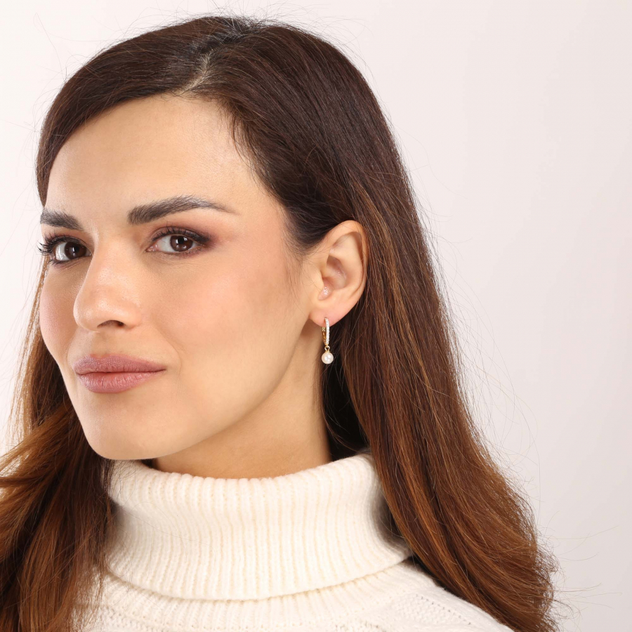Elegantne prevedené a pôvabne zdobené - presne také sú jedinečné pozlátené visiace náušnice 11426.1 zdobené zirkónmi a shell perličkou.