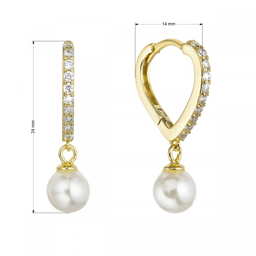 Pozlátené strieborné náušnice srdca so zirkónmi a visiacou perličkou shell 11426.1