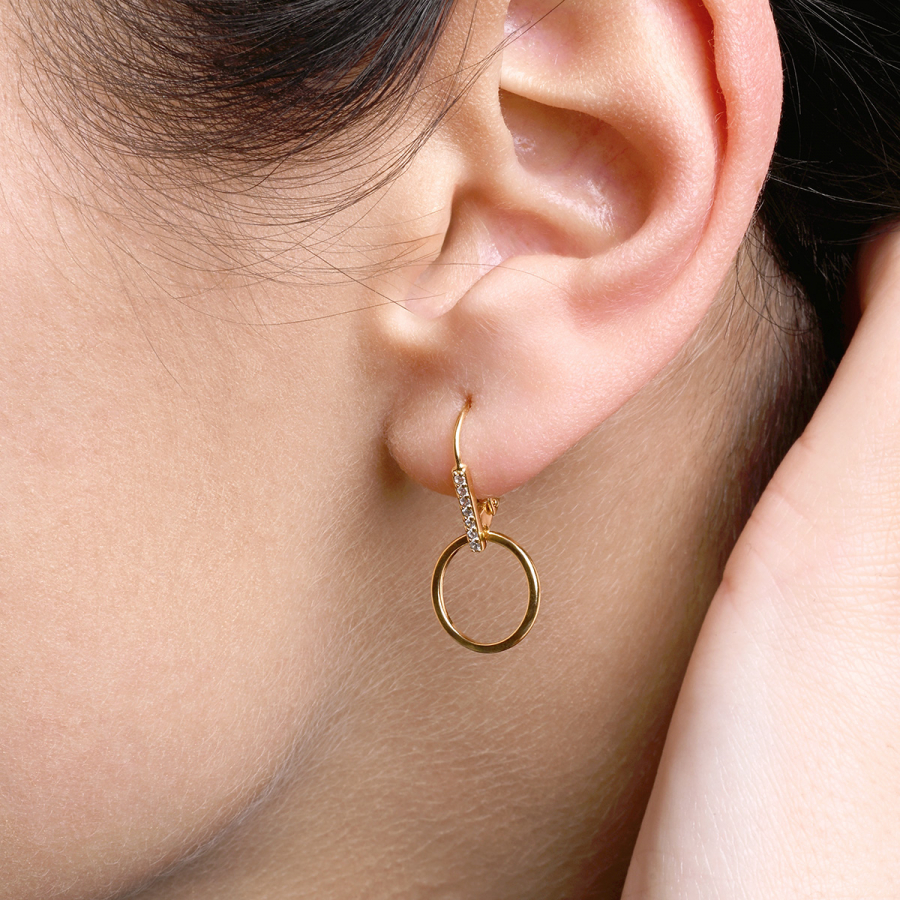 Náušnice sú vyrobené z pozláteného striebra o rýdzosti 925/1000 a majú zapínanie na klapku zdobenú zirkónmi , ktorá zaisťuje pohodlné nosenie po celý deň. Navyše je ozdobená drobnými kamienkami. Krúžok celkový vzhľad dopĺňa a dodáva mu zaujímavý a moderný dotyk.