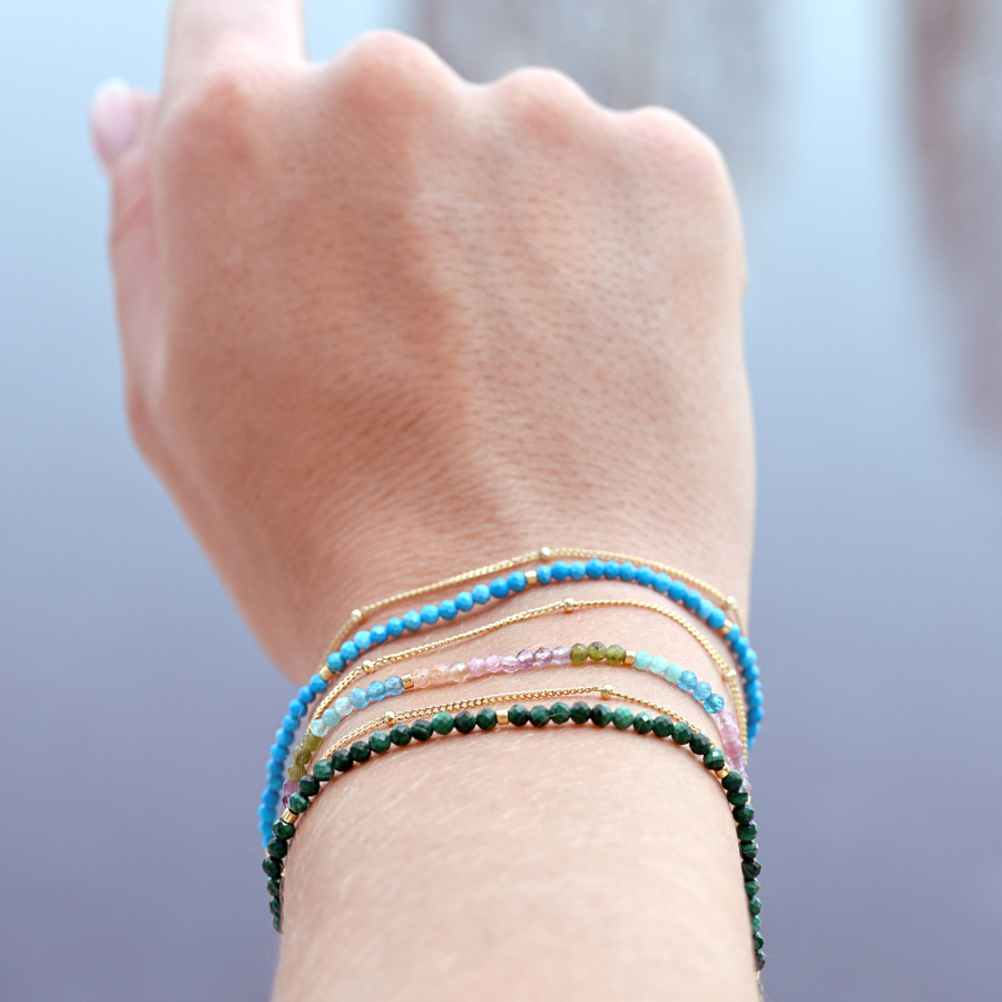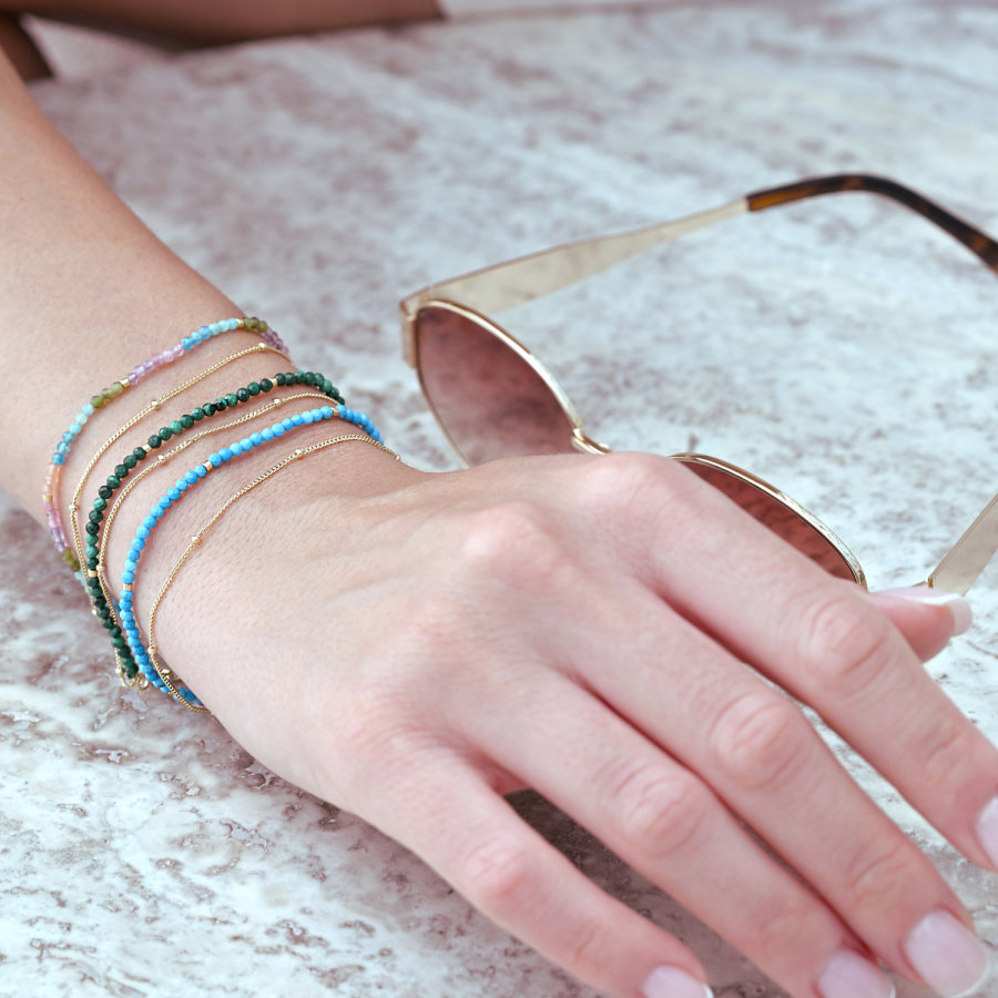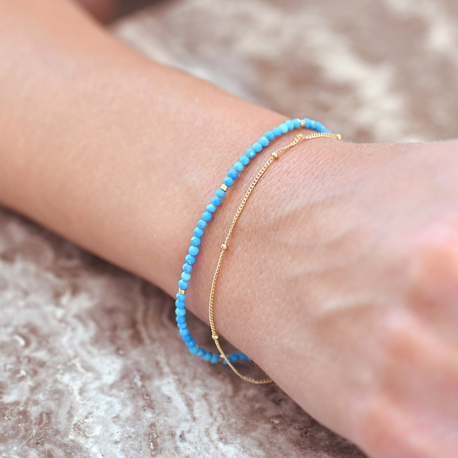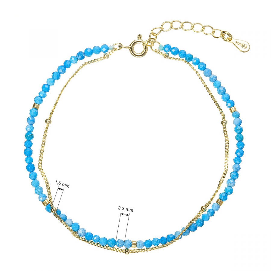 Tento jemný dvojitý náramok spája tenkú retiazku z pozláteného striebra a líniu drobných brúsených korálikov z pravého howlitu farbeného do žiarivo modrej farby. Pozlátené striebro rýdzosti 925/1000 dodáva šperku teplý zlatistý tón a elegantný vzhľad. Náramok je vybavený zapínaním na karabínku a praktickou adjustou, vďaka ktorej je možné jeho dĺžku pohodlne upraviť zo 17 cm až o ďalšie 4 cm . Štýlový, ľahký a moderný doplnok, ktorý dokonale rozžiari každý outfit.