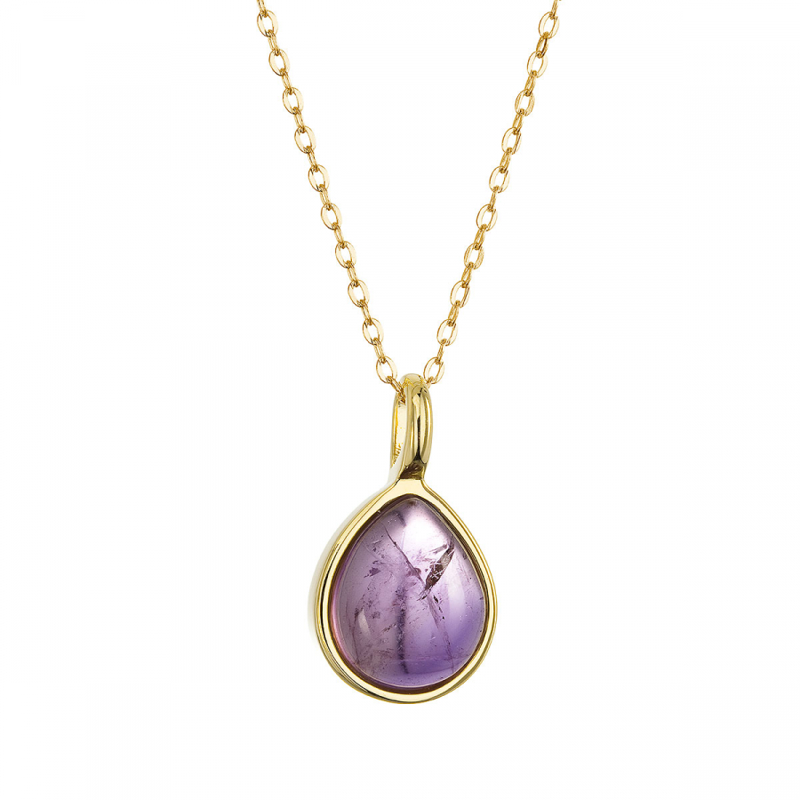 Náhrdelník je vyrobený zo striebra rýdzosti 925/1000 s jemným pozláteným povrchom , ktorý prepožičiava šperku luxusný a teplý lesk. Jeho jedinečný tvar kvapky je precízne zdobený prírodným ametystom vo fialovej farbe, ktorý je lemovaný zlatistou linkou pozláteného striebra.