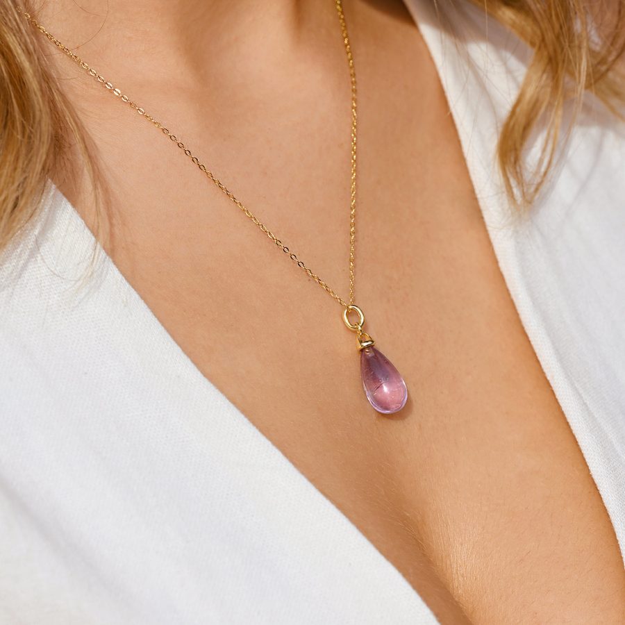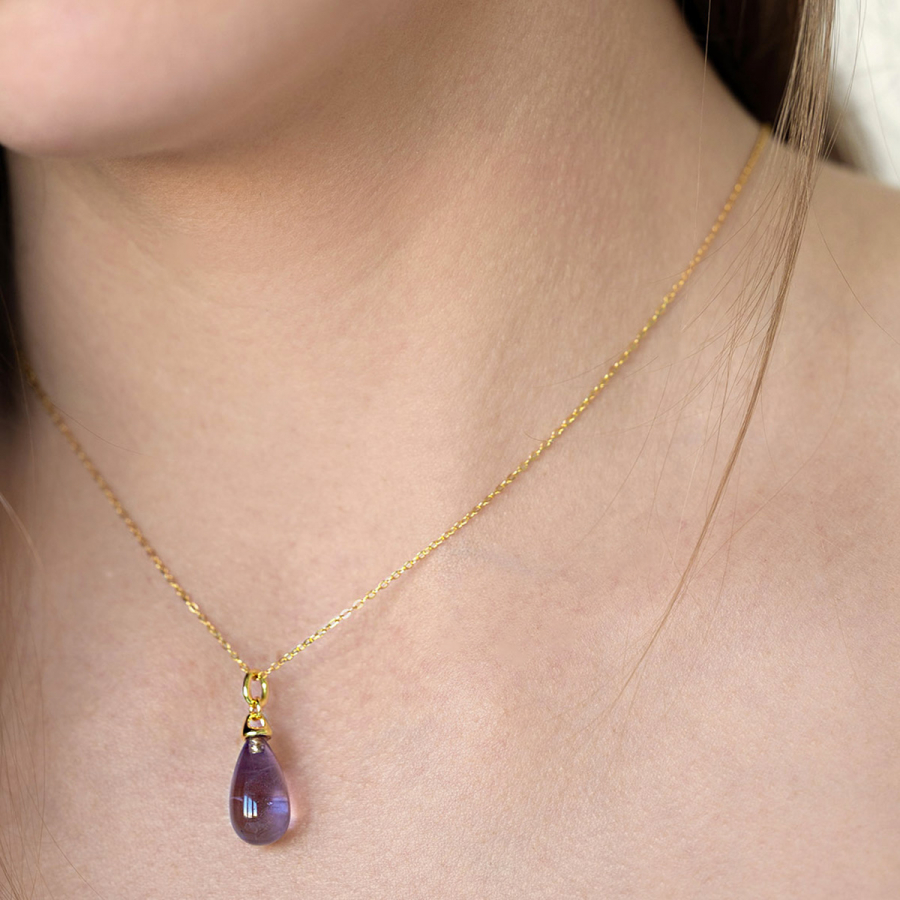 Náhrdelník s príveskom je majstrovským skvostom, ktorý dokonale spája čistú eleganciu striebra rýdzosti 925/1000 s jemným zlatým nádychom a očarujúcou krásou vzácneho prírodného ametystu. Luxusný prívesok v tvare pretiahnutej kvapky vás okamžite vtiahne do magického sveta tajomstva, vnútornej sily a nespútanej ženskosti. Každý detail tohto šperku je premyslený tak, aby rozprával príbeh výnimočnosti a krásy.