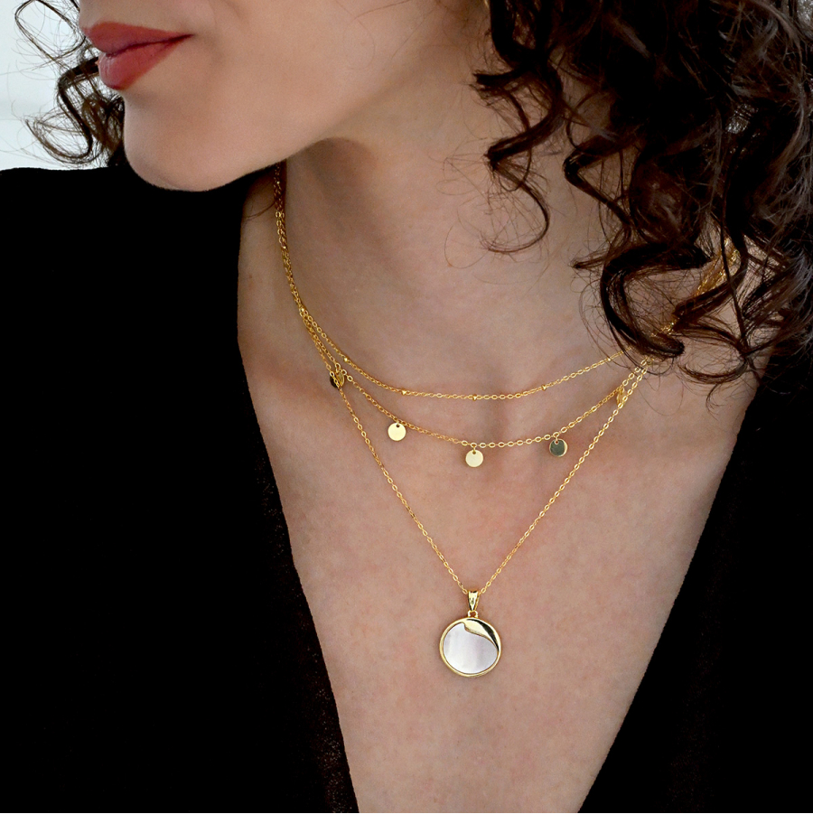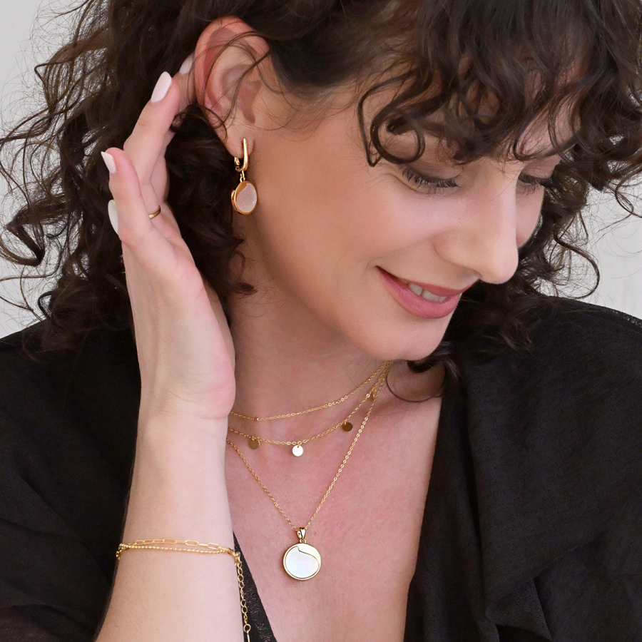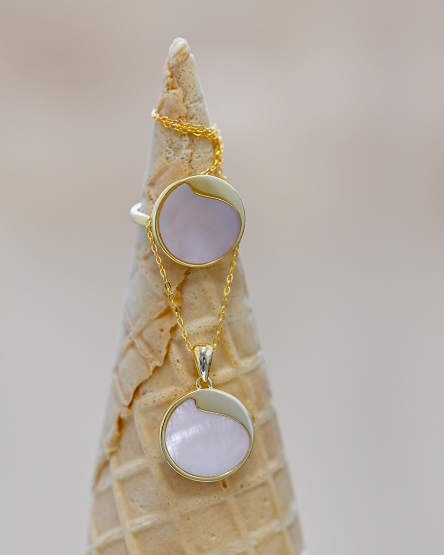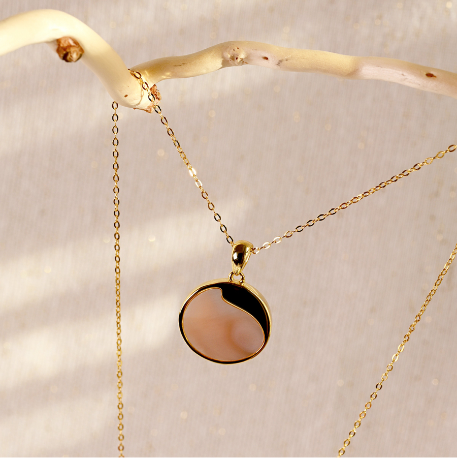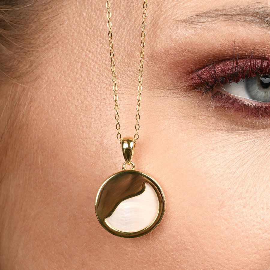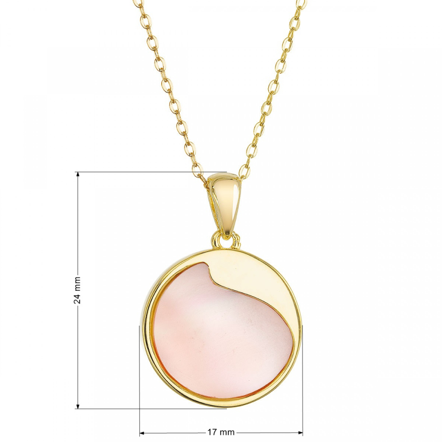Náhrdelník s príveskom je vyrobený z pozláteného striebra tej najvyššej kvality 925/1000. Pozlátený povrch mu dodáva teplý, jemný lesk. Koliesko zdobené pravou ružovou perleťou je decentne ozvláštnené jemným strieborným výkrojom, ktorý dodáva šperku jedinečný charakter.