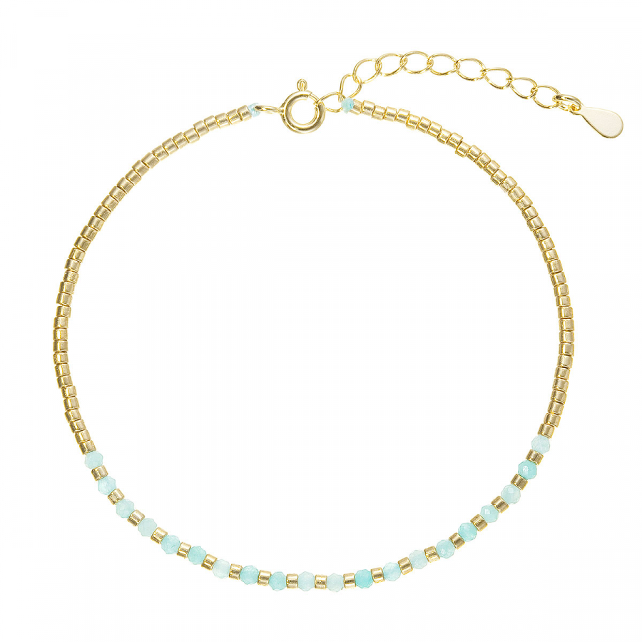 Tento jemný náramok je vyrobený z pozláteného striebra a zdobený pravými amazonitmi. Skladá sa z drobných zlatistých korálikov, ktoré tvoria väčšinu náramku, a zo sekcie svetlo modrozelených korálikov z amazonitu, ktoré mu dodávajú svieži a elegantný vzhľad.