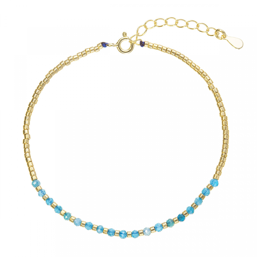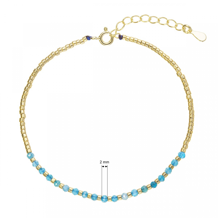 Tento jemný náramok je vyrobený z pozláteného striebra a zdobený korálkami z pravého apatitu v sýto modrej farbe. Skladá sa z drobných zlatých korálikov, ktoré tvoria väčšinu náramku, az časti z drobných modrých kamienkov apatitu, ktoré mu dodávajú živý a svieži vzhľad.