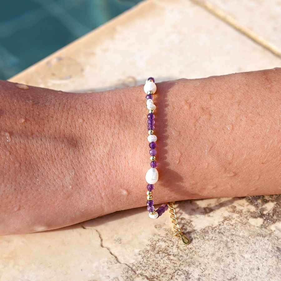 Tento elegantný náramok je tvorený kombináciou pravých ametystov v jemne fialovej farbe a pravých riečnych perál rôznych tvarov, ktoré dohromady vytvárajú harmonický a ženský celok. Drobné brúsené ametysty sa krásne lesknú a dokonale ladia s prirodzeným perleťovým ligotom perál.