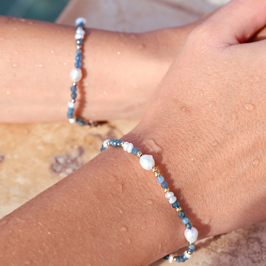 Tento jemný a elegantný náramok je tvorený kombináciou pravých riečnych perál rôznych tvarov a drobných korálikov apatitu v krásnej modrej farbe. Lesklé perly s prirodzeným perleťovým odleskom pôsobia luxusne, zatiaľ čo apatity dodávajú šperku sviežosť a ľahko morský nádych.