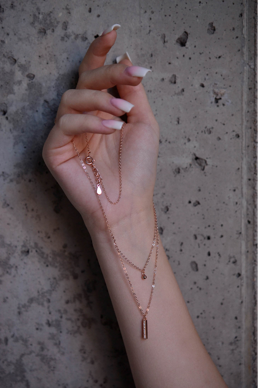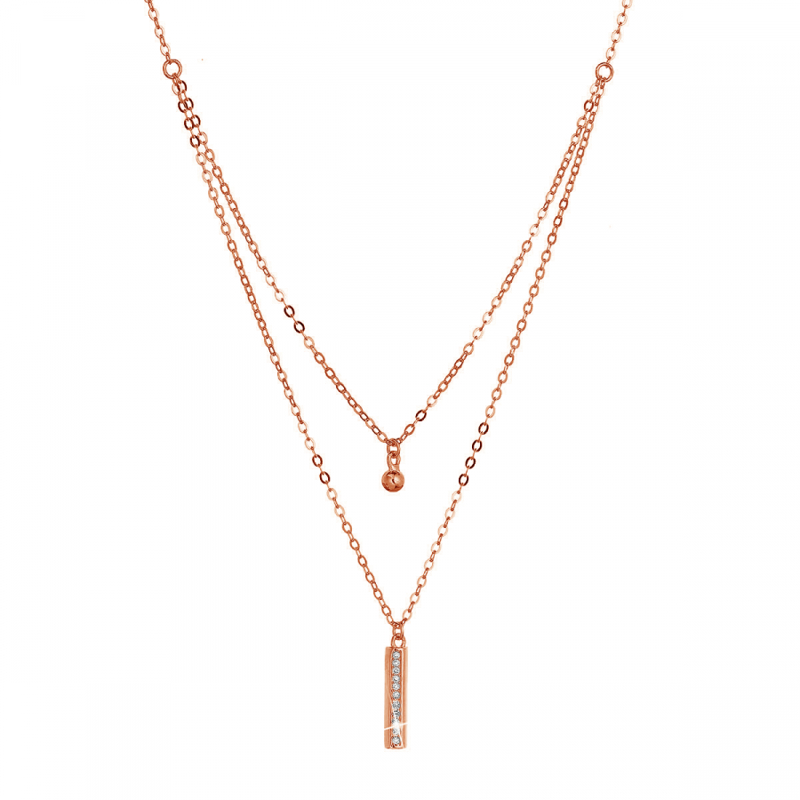 Ružovo pozlátený strieborný náhrdelník s obdĺžnikom bohato vysadeným zirkónmi na jednej retiazke a na druhej gulička .