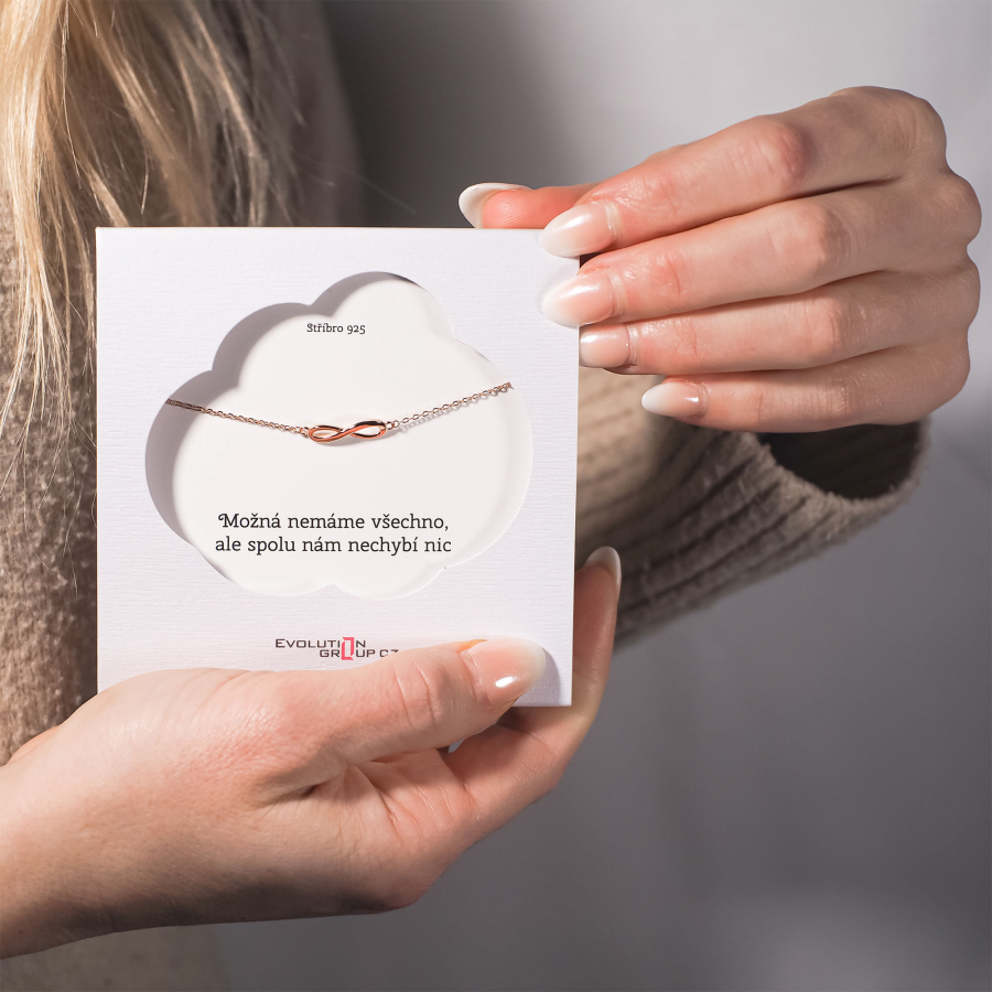 Veľmi nežne pôsobiaci jednoduchý náramok v tvare nekonečna v trendy Rose Gold prevedení. Náramok symbolizujúci okamihy, ktoré si chceme udržať v pamäti na nekonečne dlho. Krásny vkusný darček pre vašu kamarátku, sestru alebo dcéru. Drobné gesto, ktoré urobí obrovskú radosť.