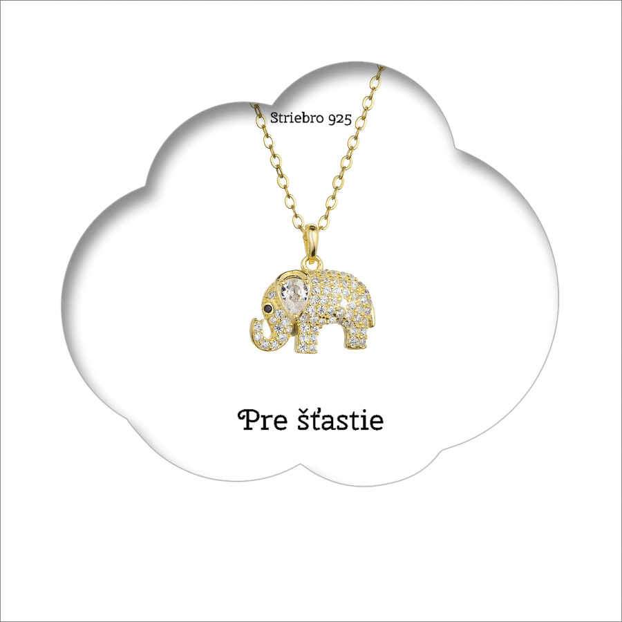 Darčekový set obsahuje pozlátený strieborný náhrdelník slon s bielymi zirkónmi , ktorý je zavesený na darčekovej karte s nádherným prianím „Pre šťastie“.