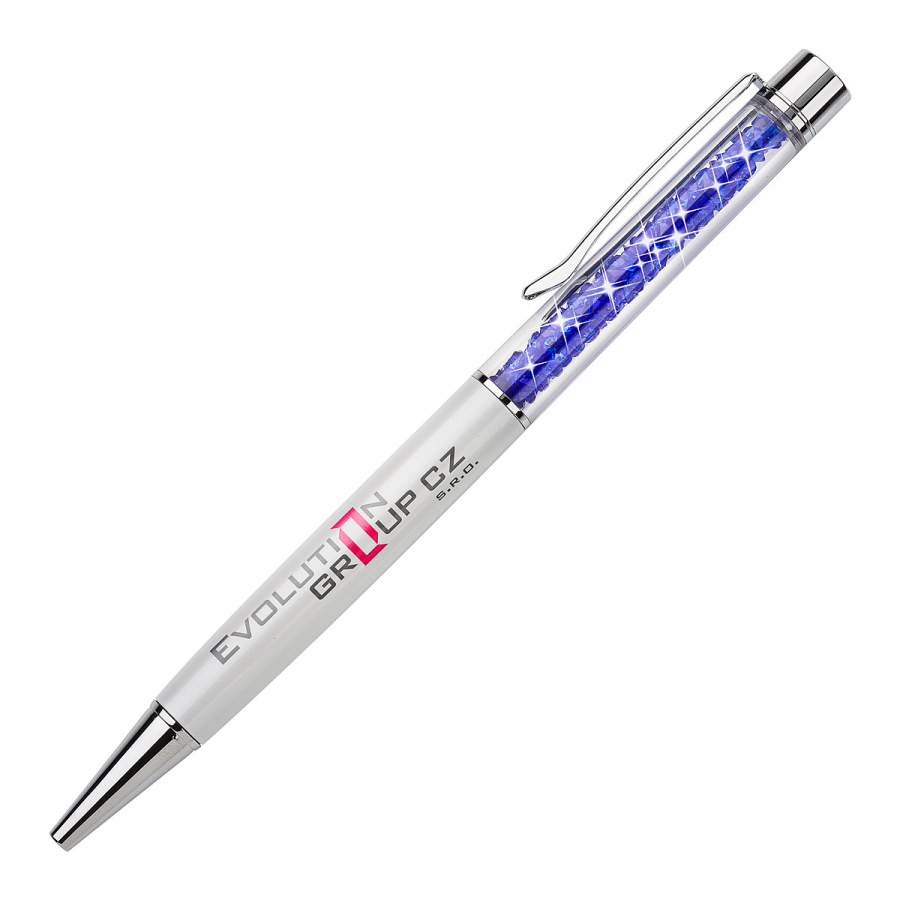 Elegantné pero zdobené kryštálmi Swarovski je luxusný písací doplnok, ktorý zaujme svojim jedinečným dizajnom. Telo perá je vyrobené z kvalitného materiálu, často kovového alebo akrylového a je zdobené veľkým množstvom modrých kryštálov Swarovski, ktoré sa trblietajú na svetle.