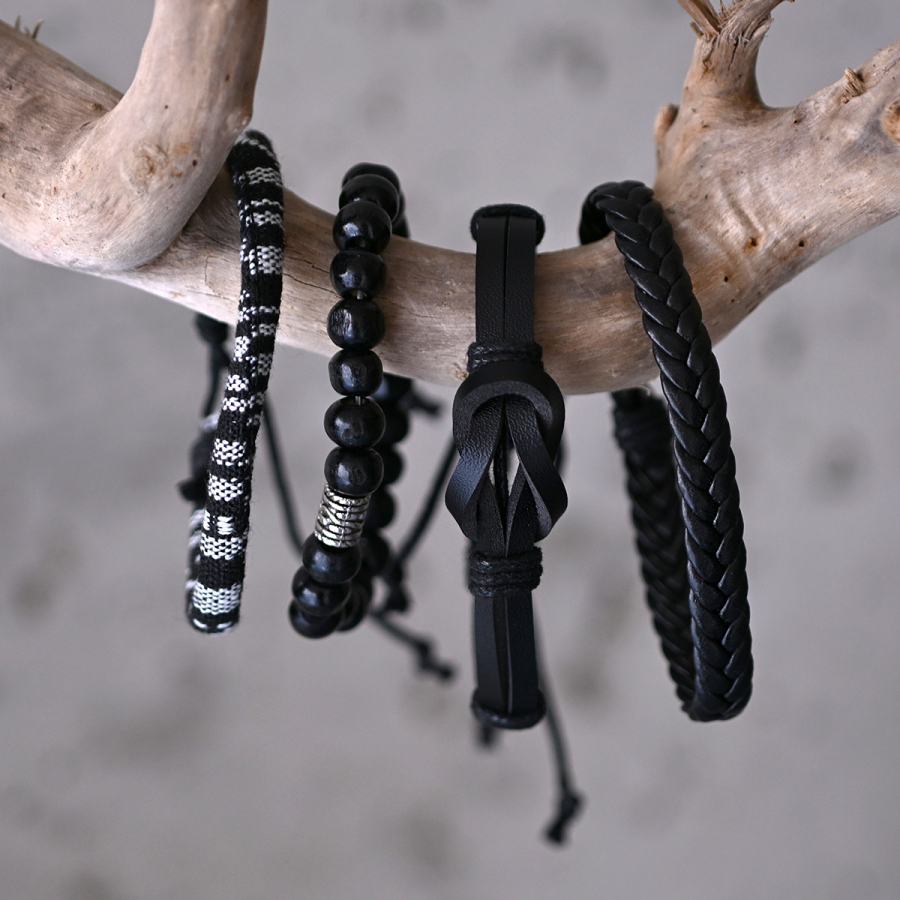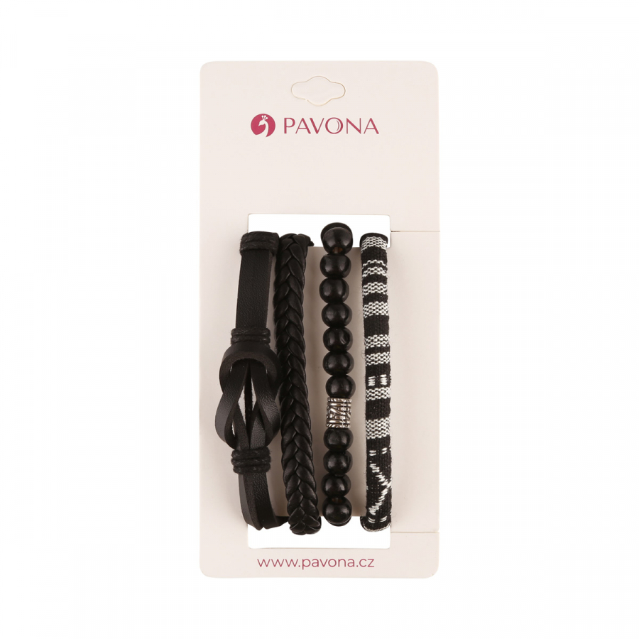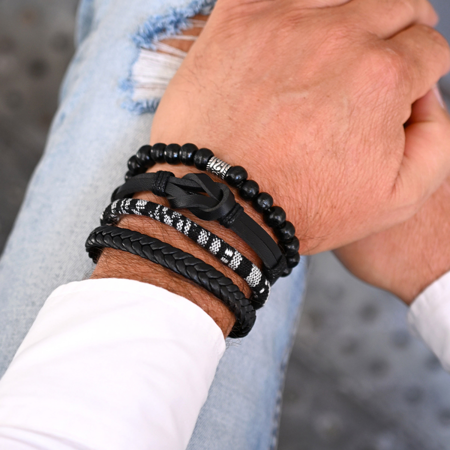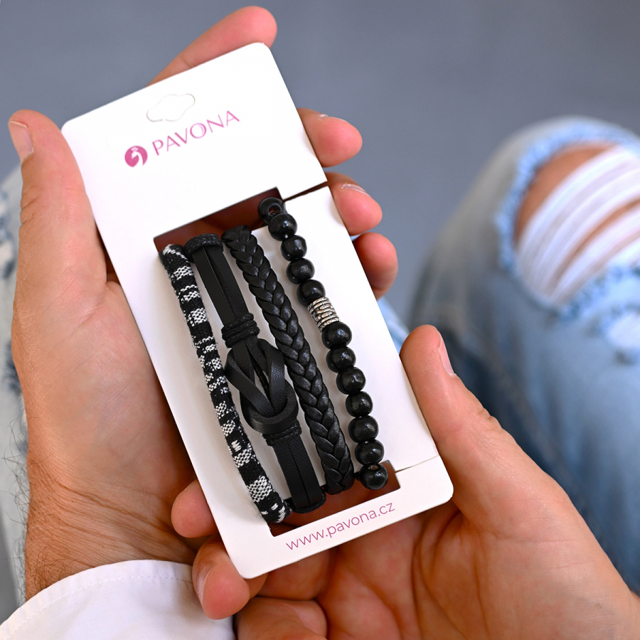 Objavte jedinečnú sadu pánskych náramkov, ktorá kombinuje trendy vzhľad s praktickosťou. Štyri rôzne náramky v jednom balení umožňujú nekonečné kombinácie a ich čierno-biela farebnosť sa hodí ku každému outfitu.