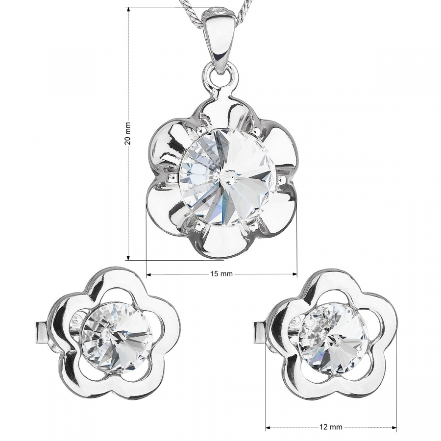 Súprava šperkov 39173.1 obsahuje náušnice a retiazku s príveskom v tvare kvietkov. Šperky sú vyrobené zo striebra rýdzosti 925/1000, ktoré prešlo povrchovou úpravou ródiom. Ródium chráni šperk proti sčerneniu, zožltnutiu i poškriabaniu. Prívesok aj náušnice sú zdobené bielymi Swarovski kryštálmi. Náušnice majú zapínanie na puzetku. Keďže šperky neobsahujú žiadny prídavok niklu , môžu ich bez obáv nosiť aj alergici.