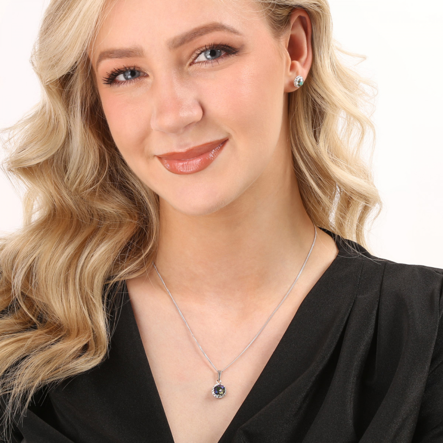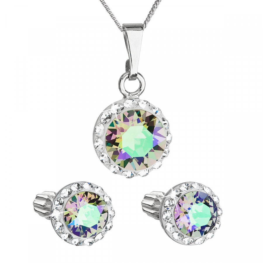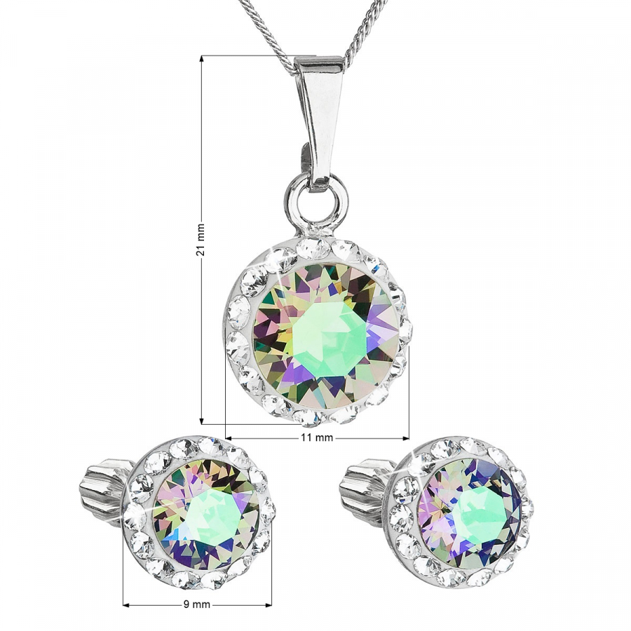 Sada 39352.5 obsahuje náušnice kôstky a retiazku s príveskom. Šperky sú vyrobené zo striebra rýdzosti 925/1000, ktoré prešlo povrchovou úpravou ródiom. Ródium chráni šperk proti sčerneniu, zožltnutiu i poškriabaniu. Prívesok aj náušnice sú zdobené okrúhlym zeleno-fialovým Swarovski kryštálom , ktorý je navyše olemovaný ešte malými trblietavými Swarovski kryštálmi v bielej farbe. Náušnice majú zapínanie na spoľahlivý balónik. Keďže šperky neobsahujú žiadny prídavok niklu , môžu ich bez obáv nosiť aj alergici.