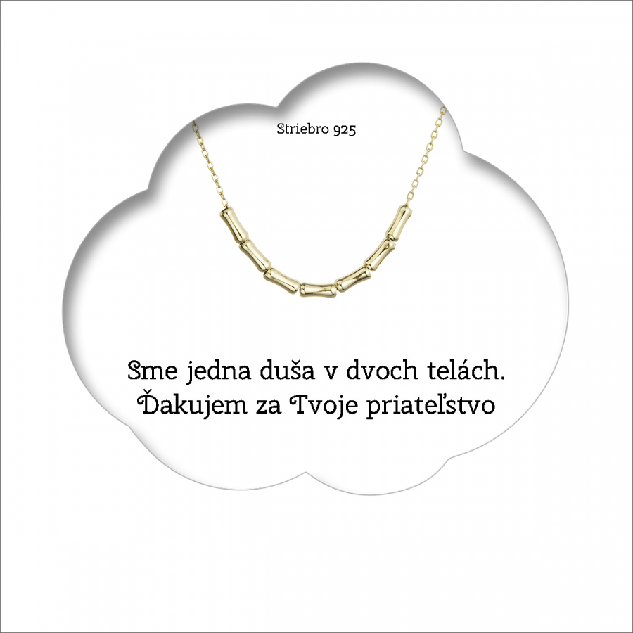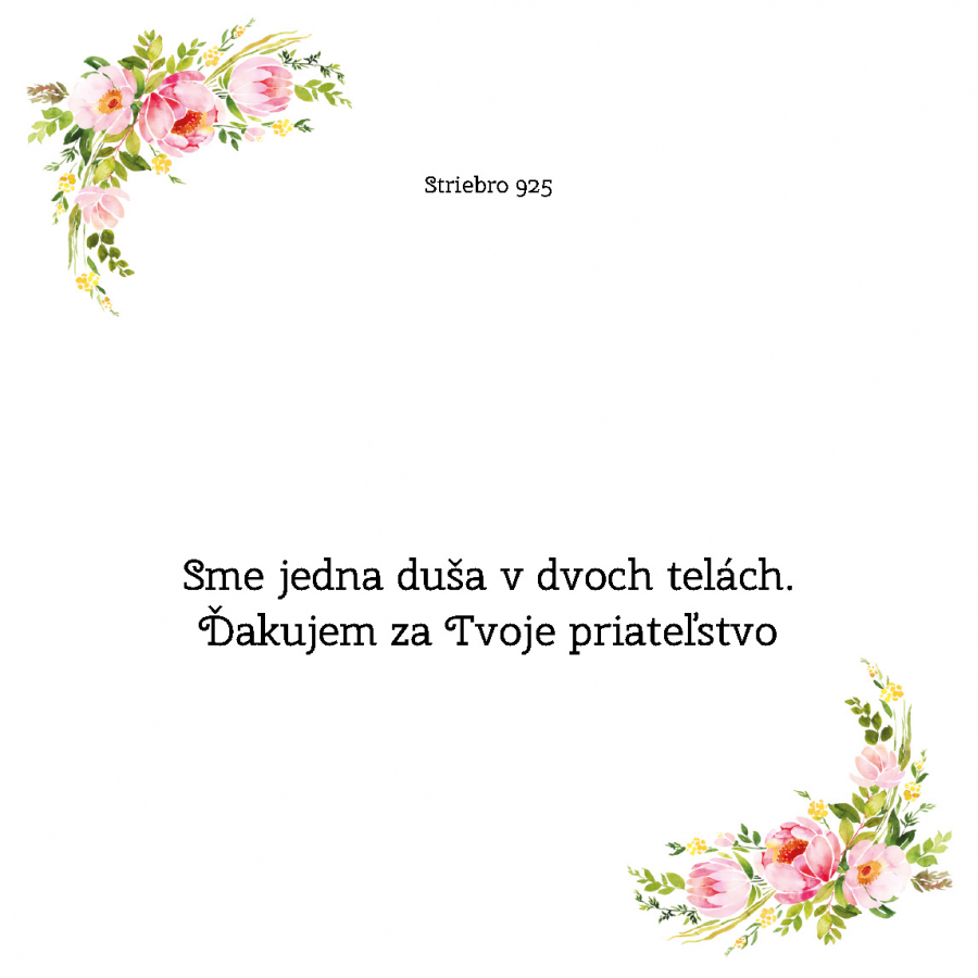Darčekový set obsahuje pozlátený strieborný náhrdelník , ktorý je zavesený na darčekovej karte s nádherným prianím "Sme jedna duša v dvoch telách. Ďakujem za Tvoje priateľstvo". Krásny vkusný darček pre vašu kamarátku, sestru alebo dcéru. Drobné gesto, ktoré urobí obrovskú radosť.