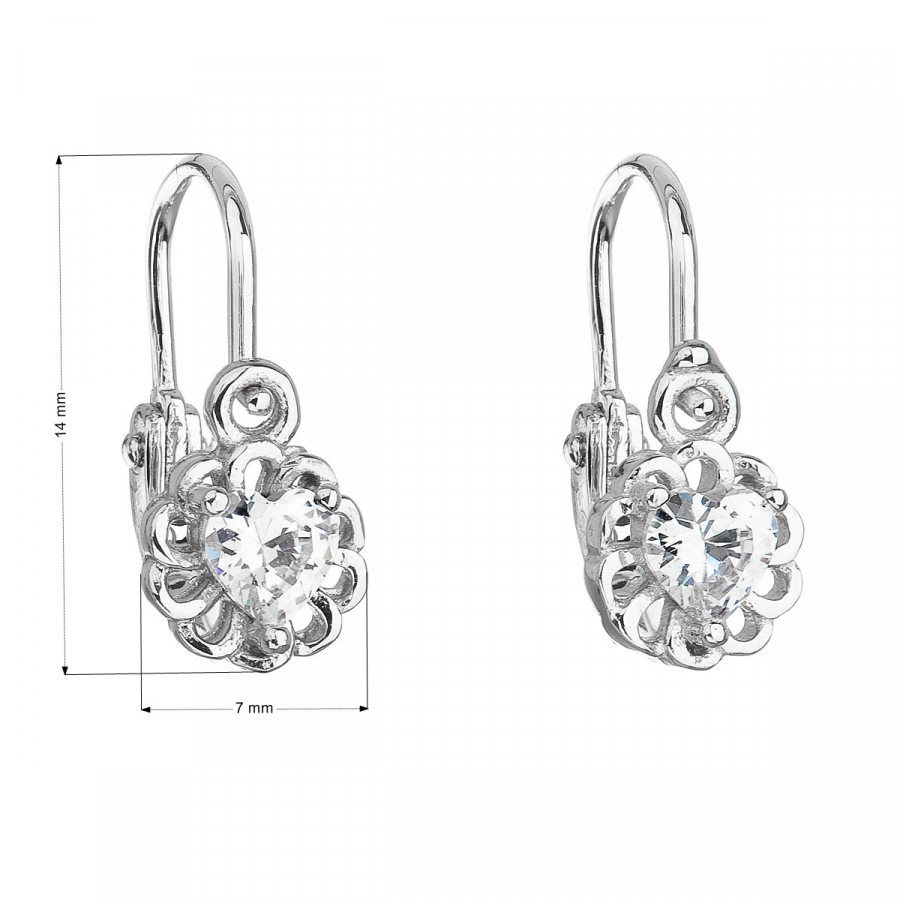 Parametre strieborných detských visiacich náušníc so zirkónom biele srdce 11173.1