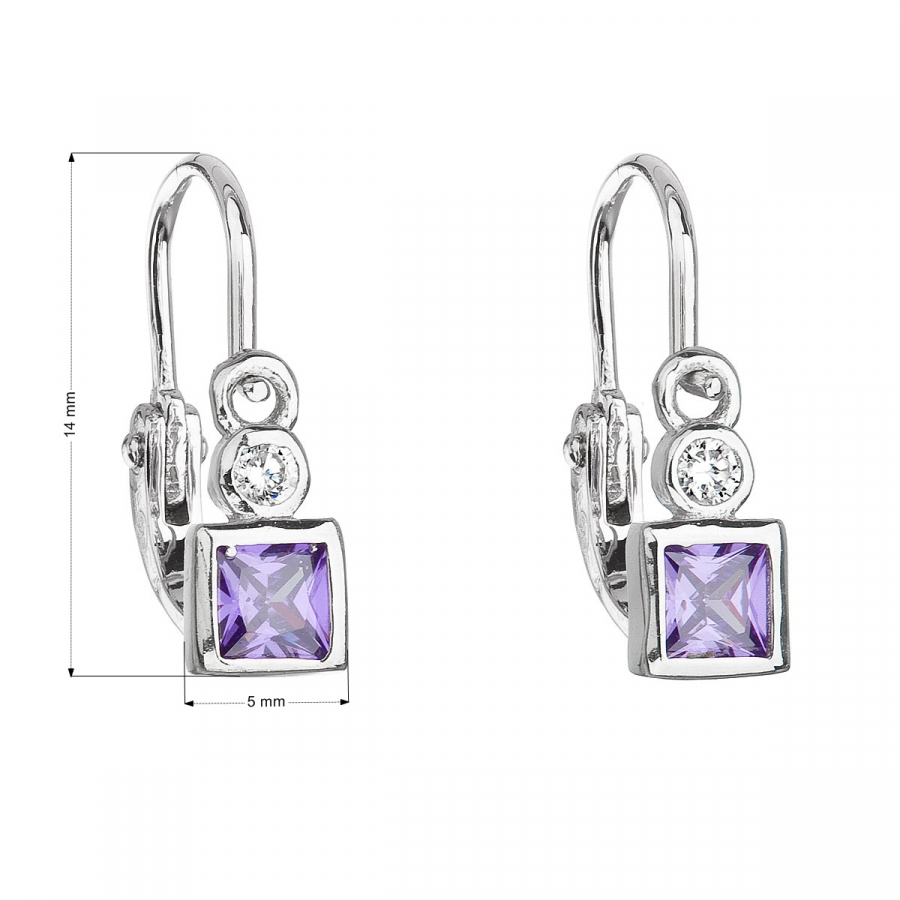 Parametre strieborných detských visiacich náušníc so zirkónom fialová kocka 11172.3