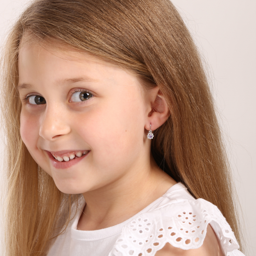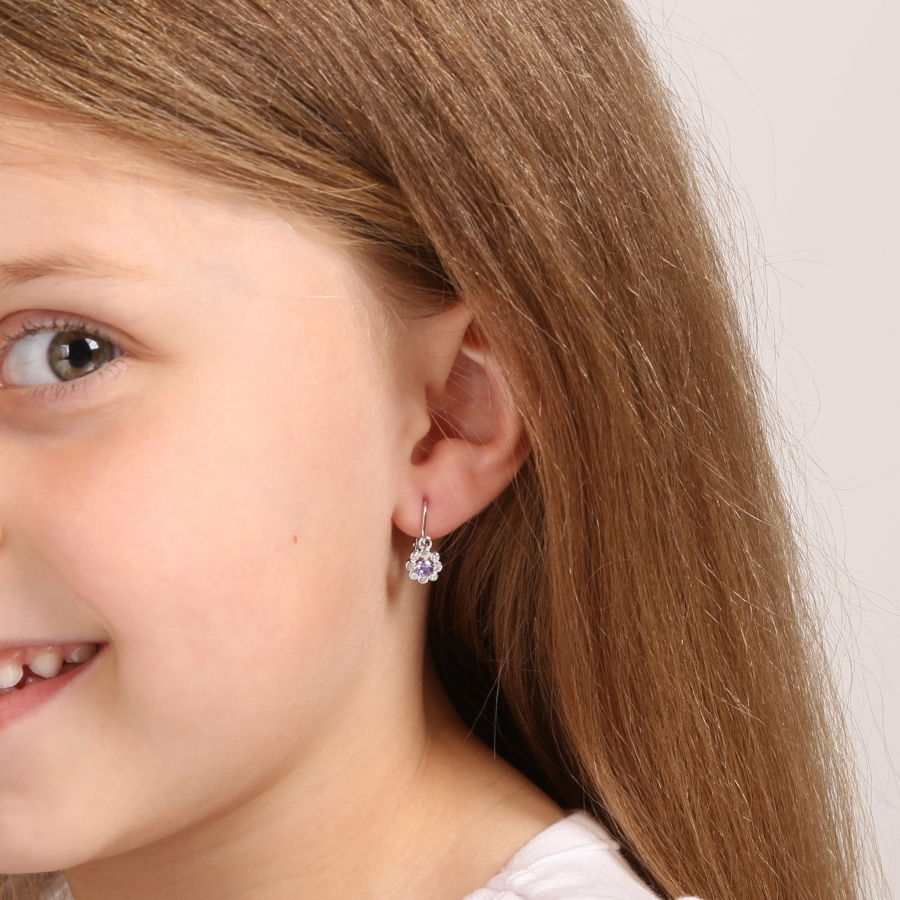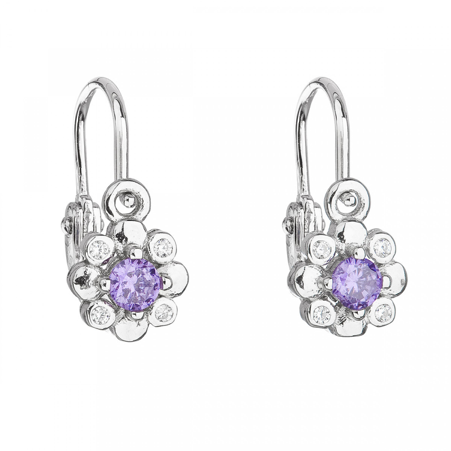 Strieborné detské náušnice visiace so zirkónom fialová kvietka 11174.3