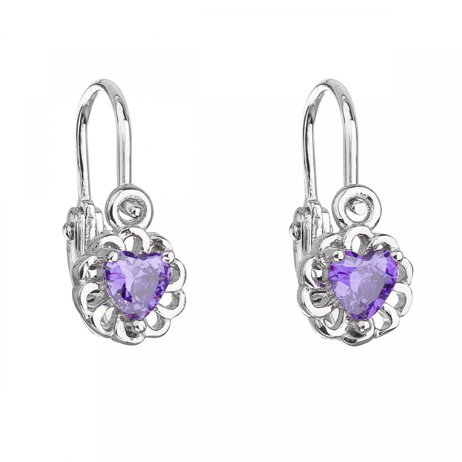 Strieborné detské náušnice visiace so zirkónom fialové srdce 11173.3