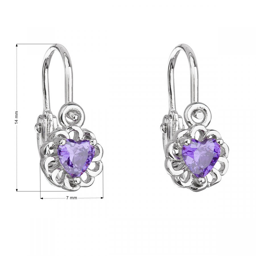 Parametre strieborných detských visiacich náušníc so zirkónom fialové srdce 11173.3