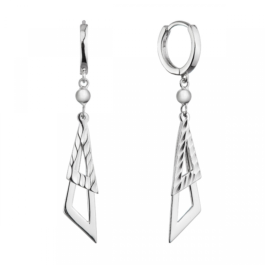 Tieto zaujímavo spracované strieborné visiace náušnice so zapínaním na krúžok zdobené zavesenými trojuholníčkami sú štýlovým doplnkom pre každú ženu. Jeden trojuholník je čisto hladký a druhý má jemný design rytiny. Tieto náušnice sú skvelým doplnkom ako pre každodenné nosenie, tak aj pre špeciálne udalosti.