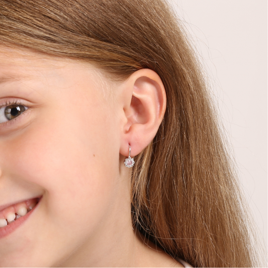 Visiace náušnice 11476.3 sú vyrobené zo striebra rýdzosti 925/1000 , ktorého povrch je upravený ródiom. Rhodium šperk ochráni proti sčernaniu, zožltnutiu alebo poškriabaniu. Uprostred kvietku je trblietavý ružový zirkón a okvetné lístočky tvoria malé biele zirkóny. Náušnice sa zapínajú na klapku. Šperk neobsahuje nikel , a tak sa nemusíte obávať žiadne alergické reakcie. Dĺžka náušnice je 13 mm.