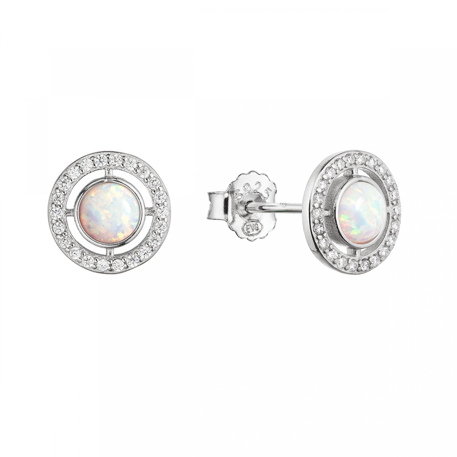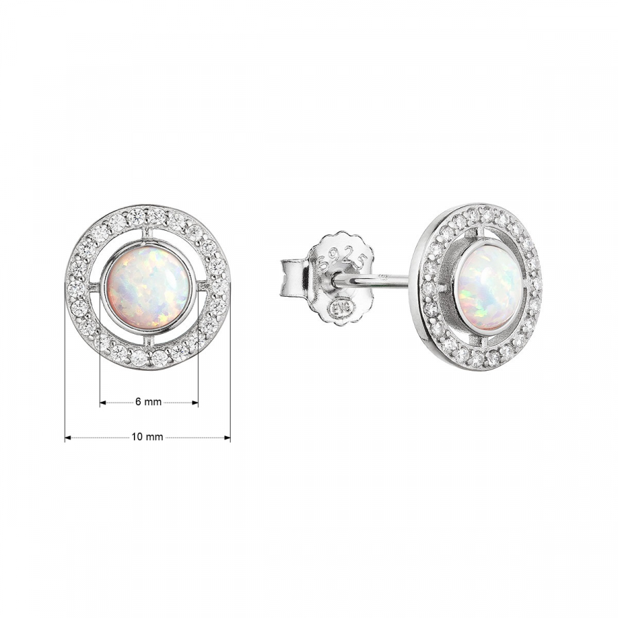 Strieborné náušnice kôstky s bielym okrúhlym syntetickým opálom a zirkónmi 11468.1 white