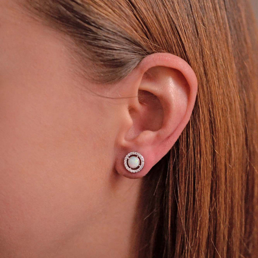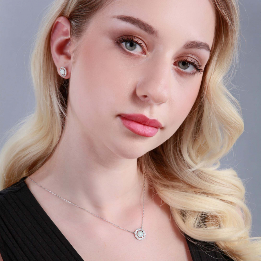 Strieborné náušnice zdobené krásnym opálom umiestneným uprostred. Opál je elegantne zasadený do strieborného kruhu , ktorý podčiarkuje jeho farby a lesk. Okolo opálu je umiestnený kruh, ktorý je zdobený zirkónmi , čím dodáva náušniciam ešte väčšiu jemnosť a lesk.