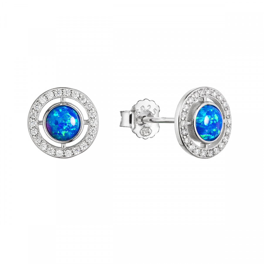 Strieborné náušnice zdobené krásnym modrým opálom umiestneným uprostred. Opál je elegantne zasadený ao koleso opálu je umiestnený kruh, ktorý je zdobený zirkónmi , čo dodáva náušniciam ešte väčšiu jemnosť a lesk.