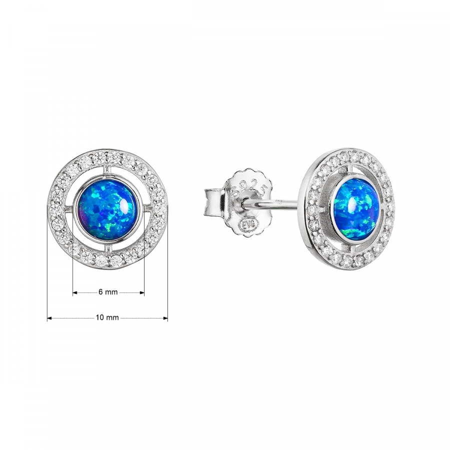 Strieborné náušnice kôstky s modrým okrúhlym syntetickým opálom a zirkónmi 11468.3 blue
