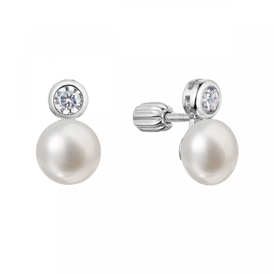 Strieborné náušnice kôstky s riečnou perlou button a jedným zirkónom 21089.1B