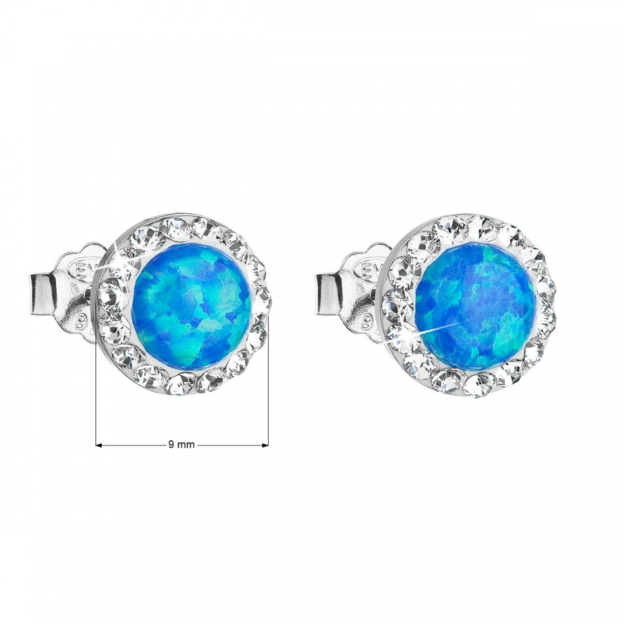 Parametre strieborných náušníc kôstok so syntetickým opálom a kryštálmi Swarovski modré okrúhle 31217.1
