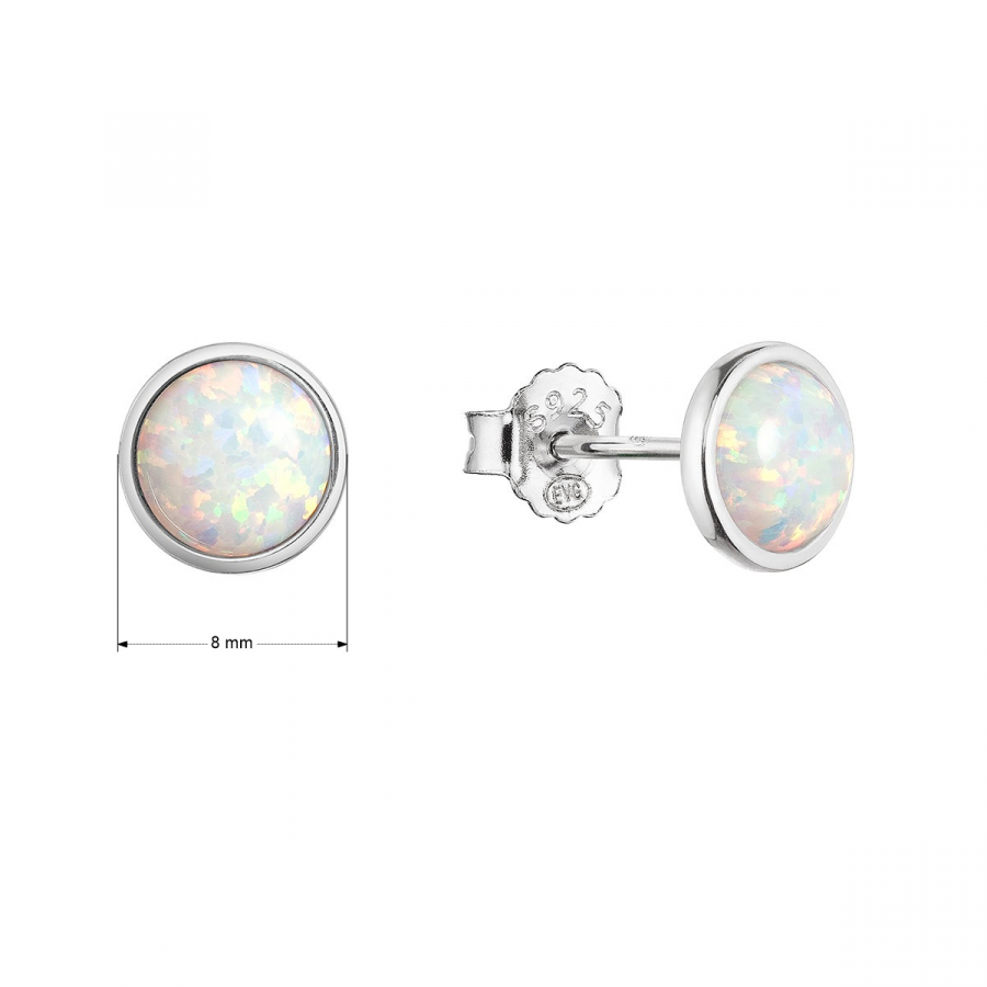 Náušnice 11464.1 zo striebra rýdzosti 925/1000, ktoré prešlo povrchovou úpravou ródiom . Vďaka ródiu je šperk odolný proti sčernaniu, zožltnutiu alebo poškriabaniu. Náušnice tvoria jeden okrúhly syntetický opál v bielej farbe.