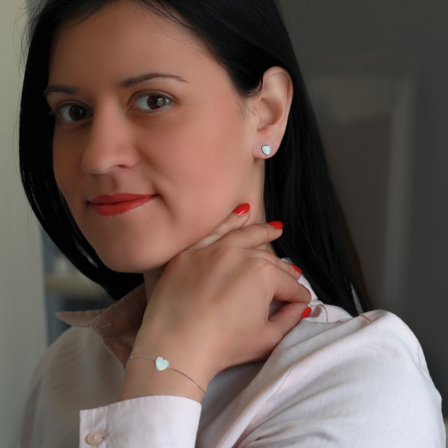Náušnice srdiečkovej kôstky tvoríme zo striebra rýdzosti 925/1000, ktoré je upravené ródiom. Vďaka ródiu je šperk odolný proti sčernaniu, zožltnutiu alebo poškriabaniu. Náušnice tvoria jeden syntetický opál v tvare srdca av bielej farbe.