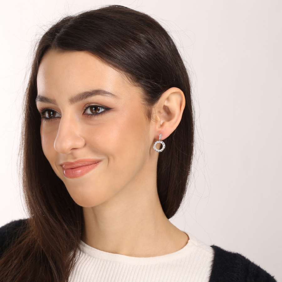 Unikátne strieborné náušnice, kde sa snúbi minimalizmus s dramatickým efektom . Zavesený krúžok, vysadený trblietavými zirkónmi, vytvára fascinujúcu hru svetla s každým pohybom vašej hlavy. Tieto náušnice kôstky z rhodiovaného striebra rýdzosti 925/1000 sú majstrovským kúskom moderného šperkárstva. Ich originálny design kombinuje klasickú eleganciu s nádherne dynamickým prvkom zaveseného kruhu, ktorý dodáva šperkom nečakanú ľahkosť a šmrnc. Vďaka pohodlnému zapínaniu na puzetu a antialergénnemu prevedeniu bez niklu sa náušnice stanú vašim obľúbeným spoločníkom pre každú príležitosť.