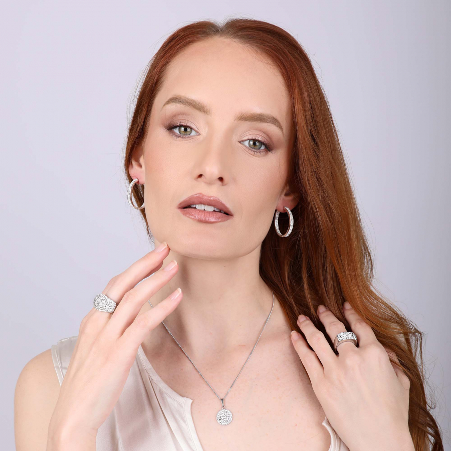 Kruhové náušnice 31122.1 s priemerom 30 mm sú vyrobené zo striebra o rýdzosti 925/1000 vrátane povrchovej úpravy ródiom. Ródium ochráni šperk proti sčerneniu, zožltnutiu i poškriabaniu. Náušnice sú bohato zdobené Swarovski kryštálmi v bielej farbe. Do šperku nie je pridaný nikel , a tak náušnice môžu bez obáv nosiť aj alergici.