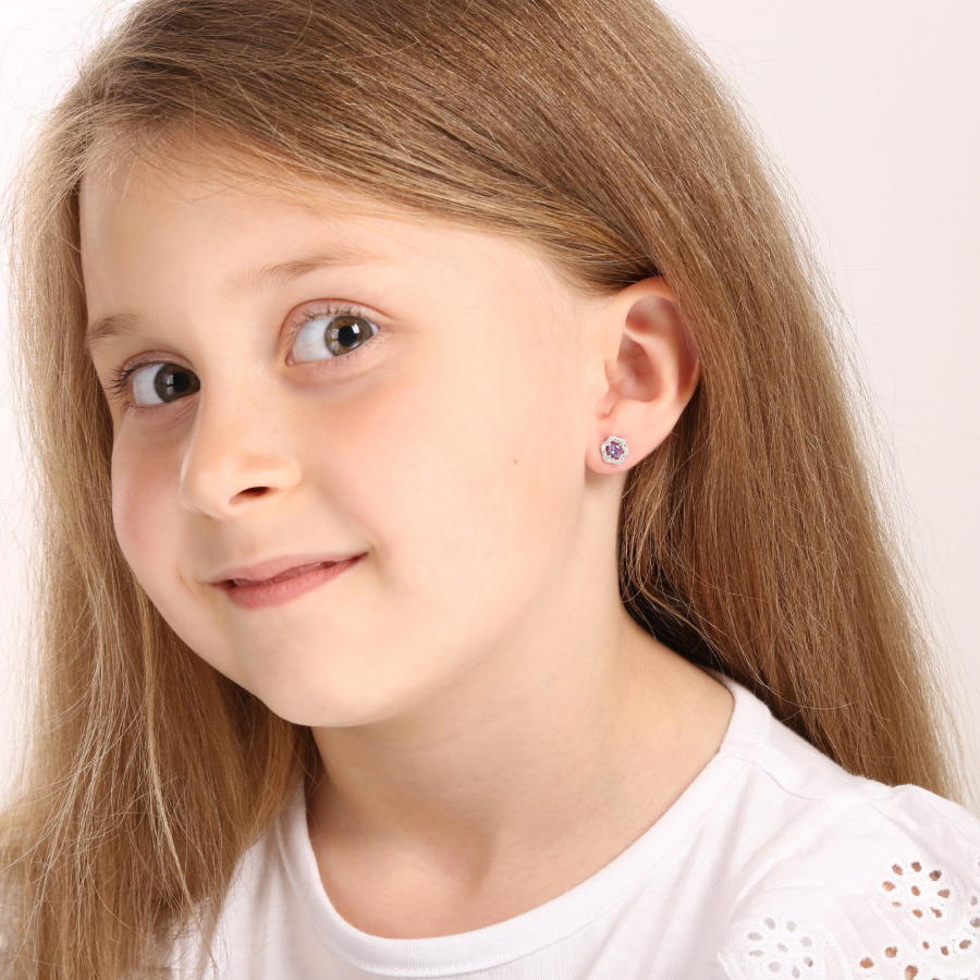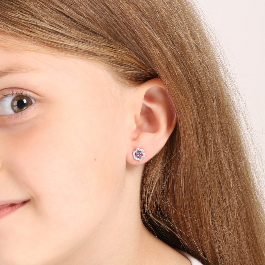 Objavte jemnú krásu náušníc 11702.3, ktoré vás okúzlia svojim kvetinovým motívom a žiarivým fialovým zirkónom uprostred. Tieto elegantné kôstkové náušnice sú vyrobené zo striebra o rýdzosti 925/1000 s ródiovou úpravou .