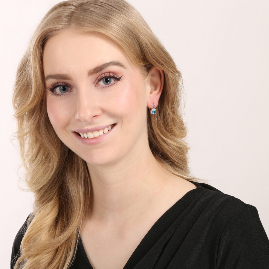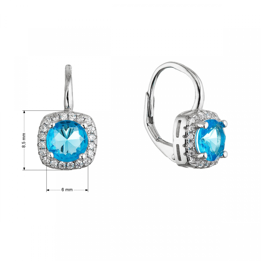Dominantným prvkom je výrazný kryštál v odtieni aqua , ktorý krásne žiari uprostred náušnice. Je obklopený drobnými čírymi kamienkami, ktoré zvýrazňujú jeho farbu a celému šperku dodávajú jemný, sofistikovaný lesk.