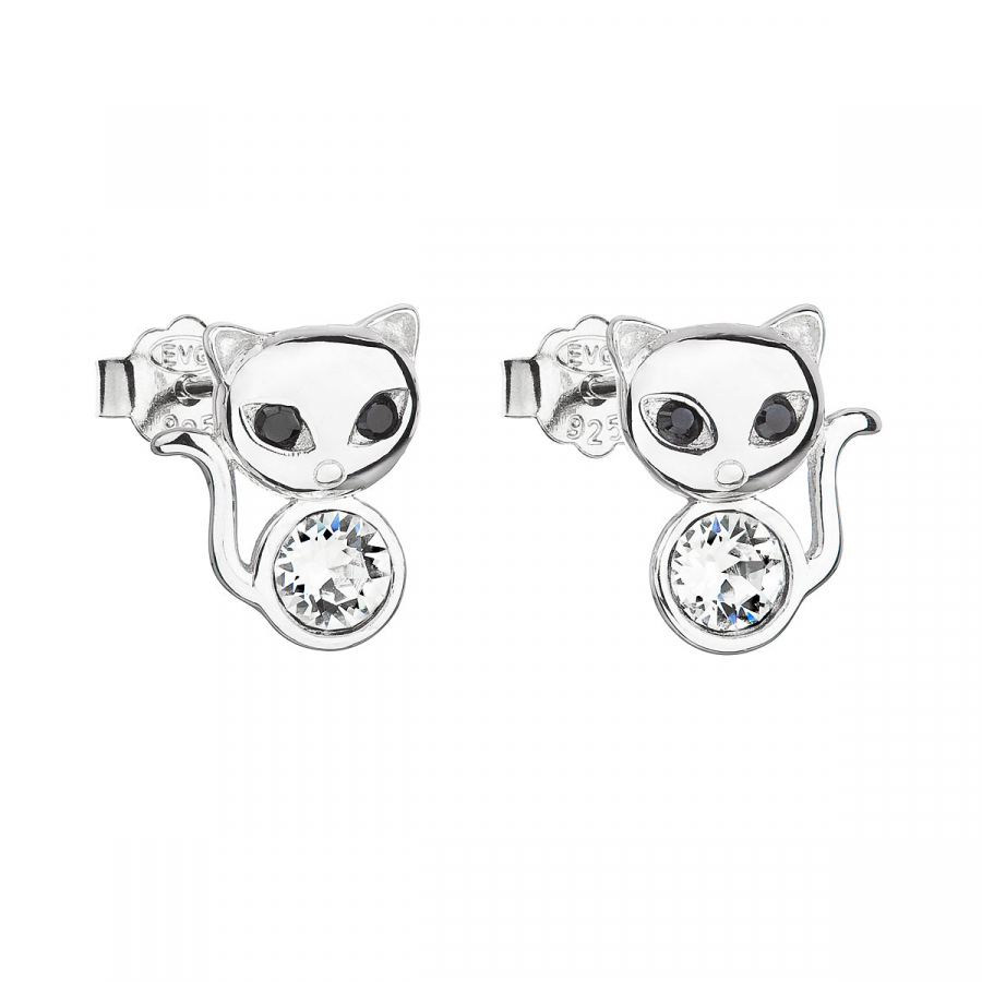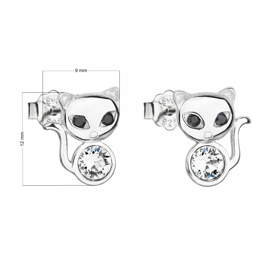 Náušnice typu kôstky v tvare mačky 31250.1 sú vyrobené zo striebra o rýdzosti 925/1000 s povrchovou úpravou ródiom a sú zdobené Swarovski kryštálmi . Bruško mačky obsahuje okrúhly biely Swarovski kryštál, oči sú vyrobené z čierneho kryštálu. Náušnice zapnete na puzetu , ktorá ich ochráni proti nechcenej strate. Keďže do náušníc nie je pridaný nikel , sú vhodné aj pre alergikov.