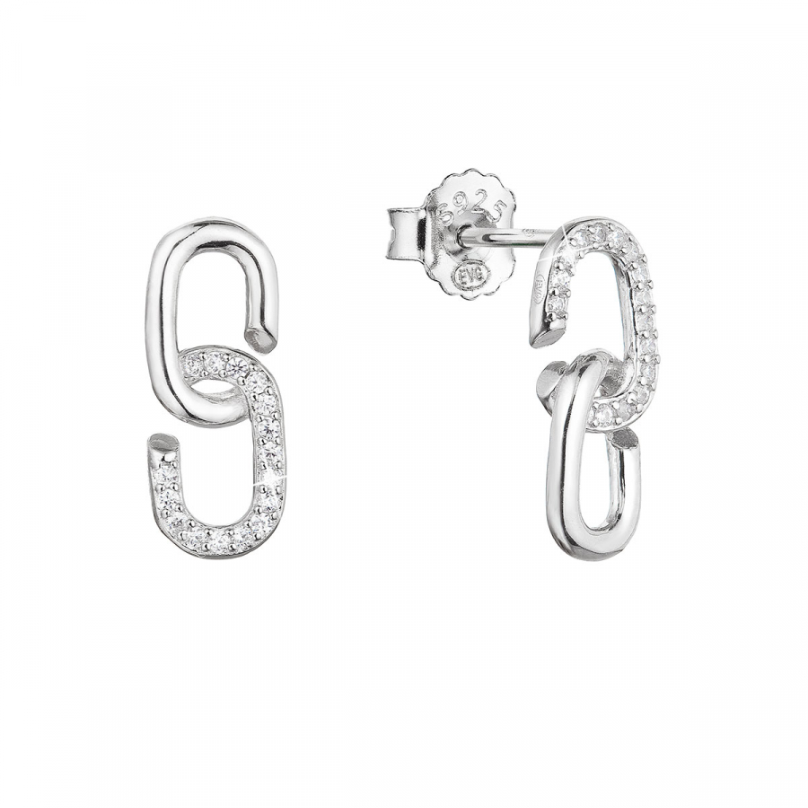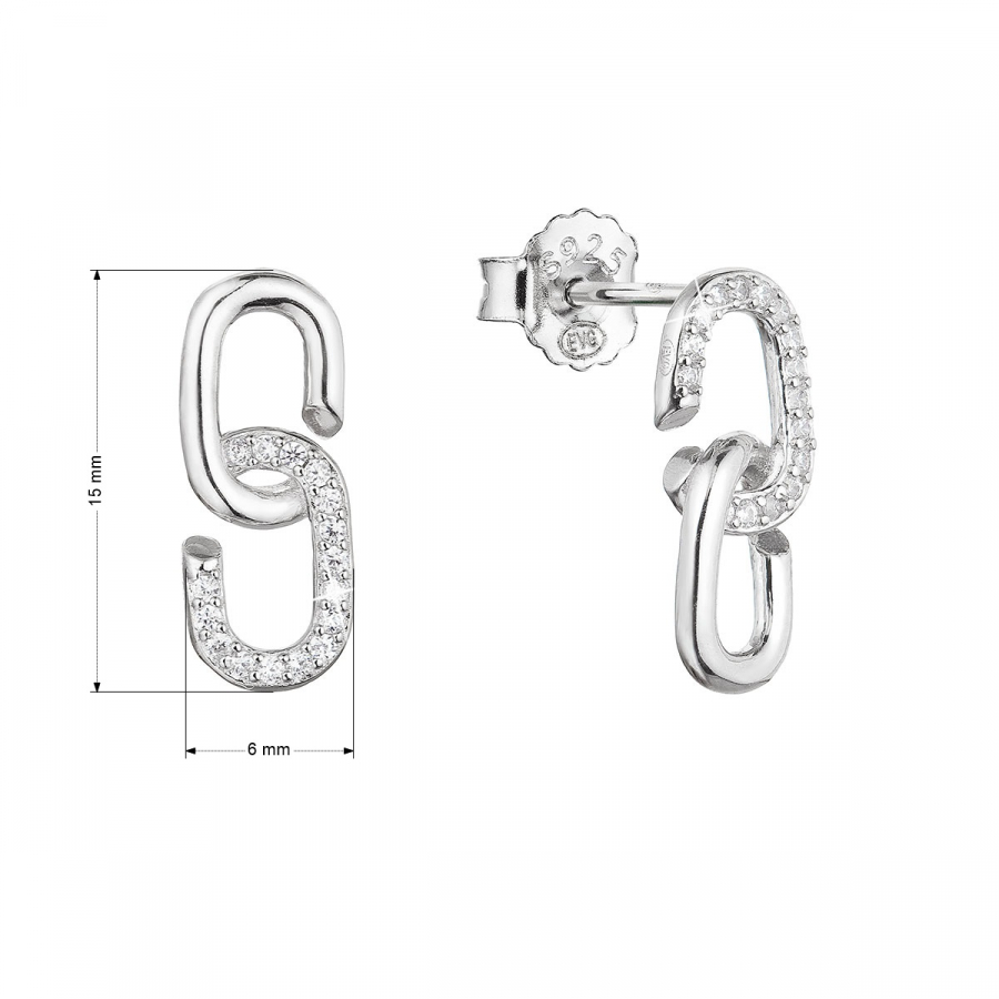 Visiace náušnice typu kôstky 11439.1 sú vyrobené zo striebra rýdzosti 925/1000. Striebro je ošetrené vrstvou ródia , ktoré ich chráni proti sčerneniu, žltnutiu i poškriabaniu. Náušnice majú originálne spracovanie dvoch do seba zapasovaných "céčok" (očiek). Šperk je zdobený trblietavými zirkónmi a keďže neobsahuje nikel, môžu ho nosiť aj ľudia náchylní na alergické reakcie. Náušnice sa zapínajú na puzetu.
