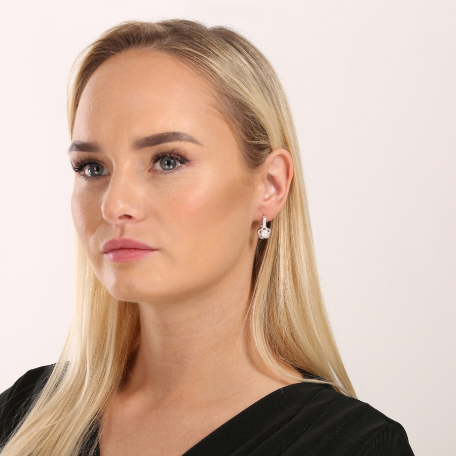 Precízne spracované strieborné náušnice v tvare kvietkov zdobené bielou okrúhlou perlou a trblietavými zirkónmi krásne rozžiaria vaše uši!