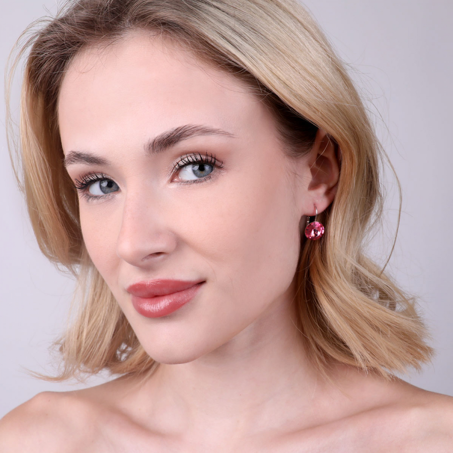Náušnice sú vyrobené zo striebra o rýdzosti 925/1000 s povrchovou úpravou ródiom a sú zdobené 12 mm širokým okrúhlym kryštálom vo farbe rose. Náušnice zapnete na klapku , ktorá ich spoľahlivo ochráni proti nechcenej strate. Do náušníc nie je pridaný nikel , a tak ich bez obáv môžu nosiť aj alergici.