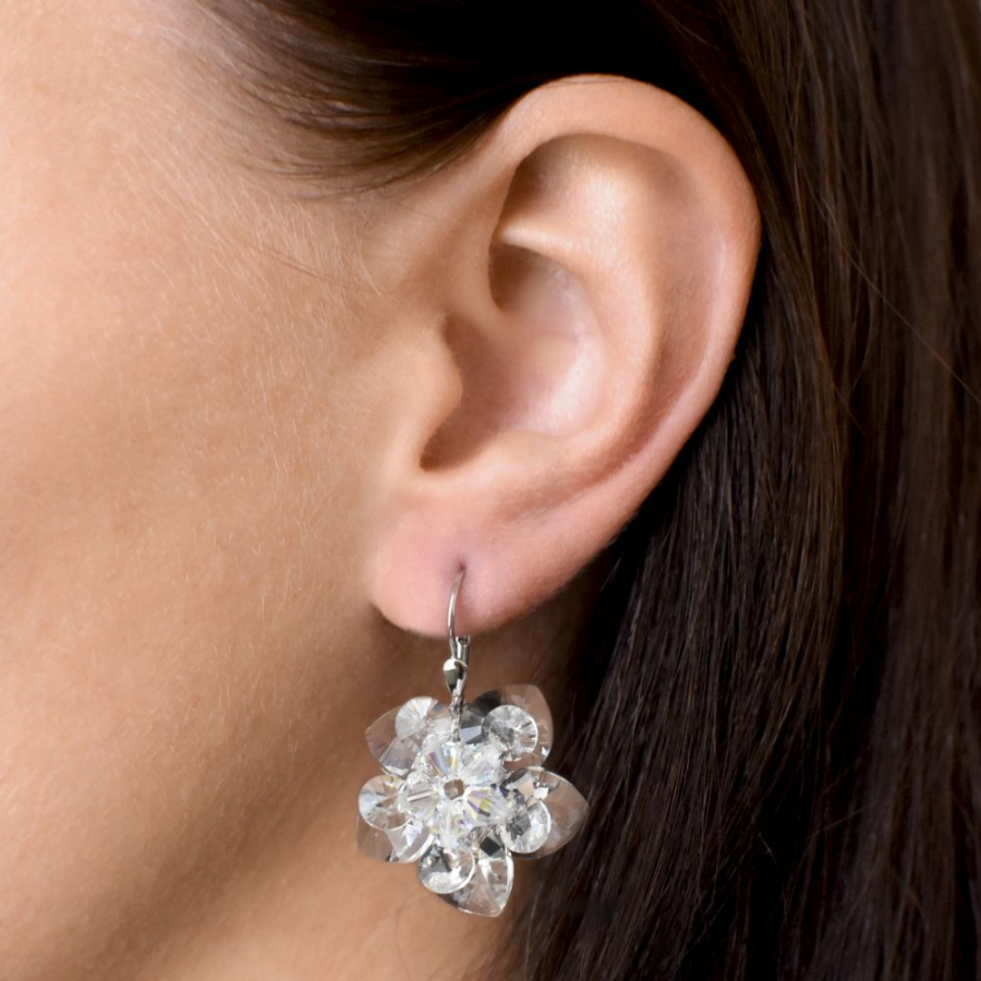 Dámske visiace náušnice 31130.1 sú vyrobené zo striebra o rýdzosti 925/1000 s povrchovou úpravou ródiom. Ródium ochráni šperk proti sčerneniu, zožltnutiu i poškriabaniu. Náušnice sú v tvare kytičky , ktorá je tvorená Swarovski kryštálmi v bielej farbe. Zapínanie náušníc je na klapku, ktorá ich spoľahlivo ochráni proti nechcenej strate. Do náušníc nie je pridaný nikel , a tak ich bez obáv môžu nosiť aj alergici.