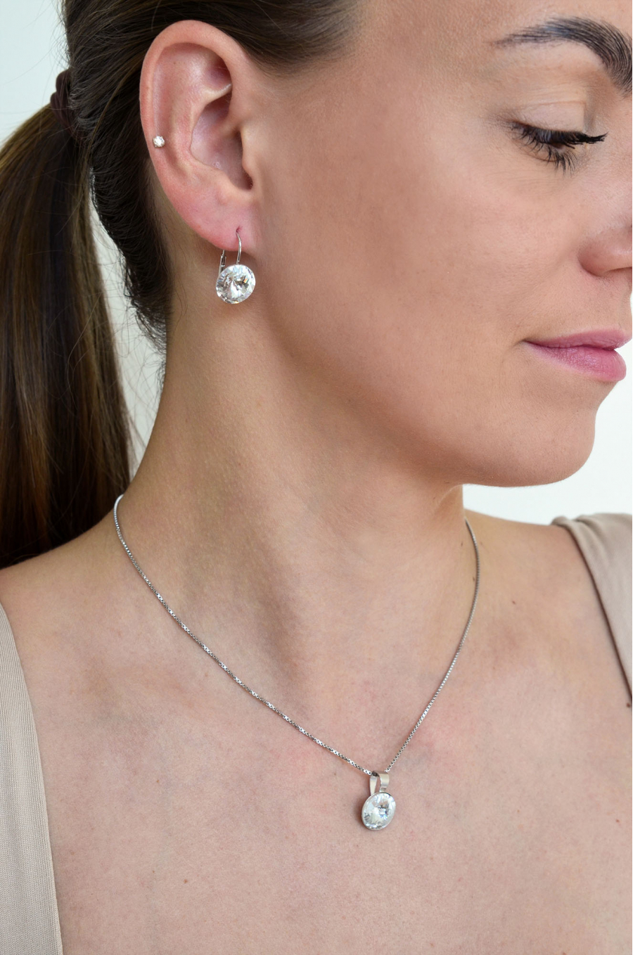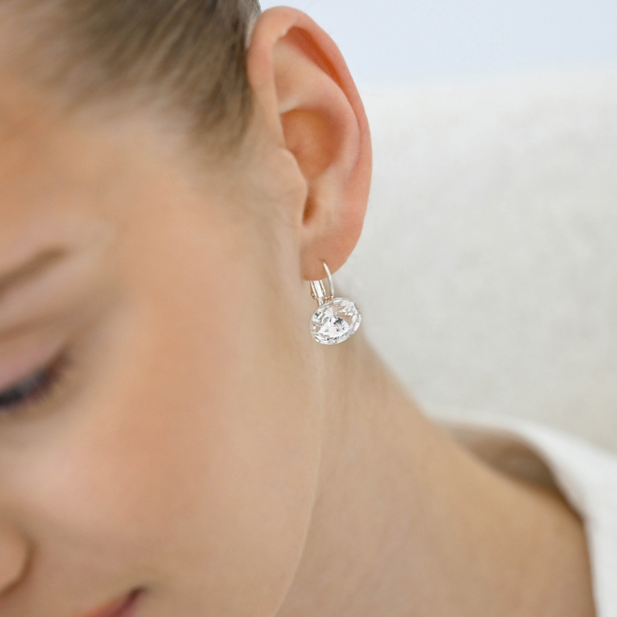 Náušnice sú vyrobené zo striebra o rýdzosti 925/1000 s povrchovou úpravou ródiom a sú zdobené 12 mm širokým okrúhlym Swarovski kryštálom v bielej farbe. Náušnice zapnete na klapku , ktorá ich spoľahlivo ochráni proti nechcenej strate. Do náušníc nie je pridaný nikel , a tak ich bez obáv môžu nosiť aj alergici.