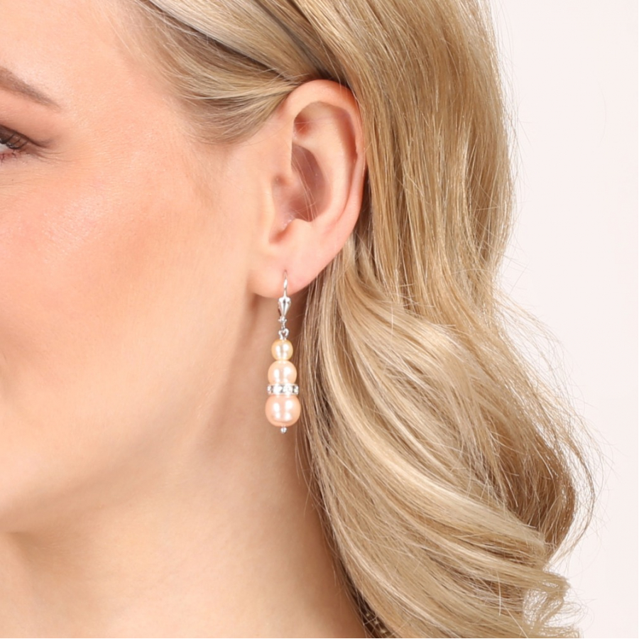 Dámske visiace náušnice 31150.3 sú vyrobené zo striebra o rýdzosti 925/1000 vrátane povrchovej úpravy ródiom a skladajú sa z troch ružových rôzne veľkých okrúhlych syntetických perál, medzi ktoré je vsadený ešte ozdobný krúžok so Swarovski kryštálmi. Trblietavé kryštály sú v bielej farbe. Náušnice sa zapínajú na klapku a keďže neobsahujú žiadny nikel , môžu ich nosiť aj alergici.