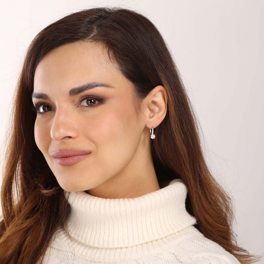 Výrazné náušnice bohato vysadené trblietavými zirkónmi podčiarknu pôvab každej elegantnej dámy .