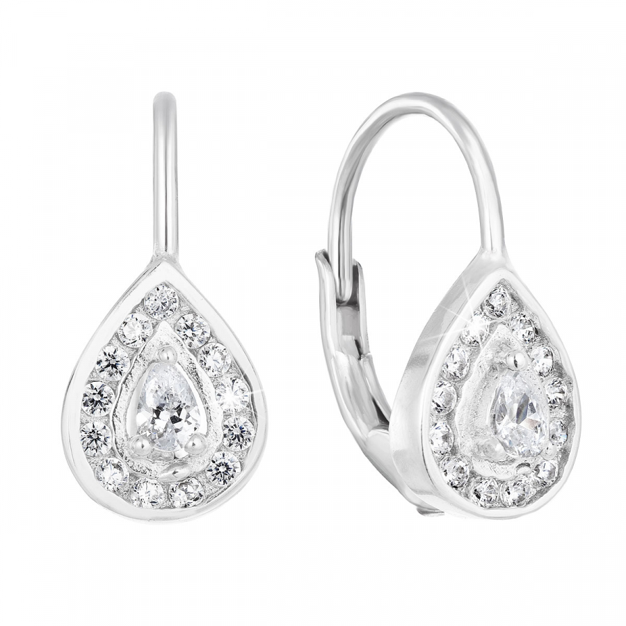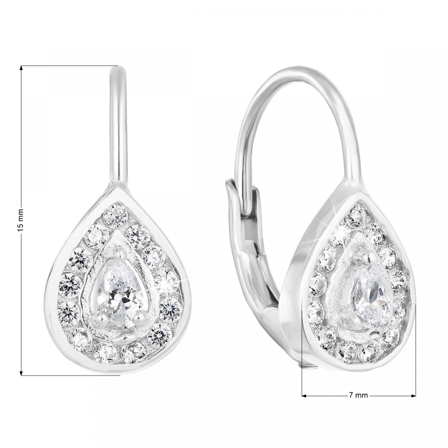 Náušnice v tvare slzy sú zdobené bielymi zirkónmi po obvode a jedným veľkým zirkónom uprostred. Praktické a jednoduché zapínanie na klapku spoľahlivo zabráni strate náušníc.