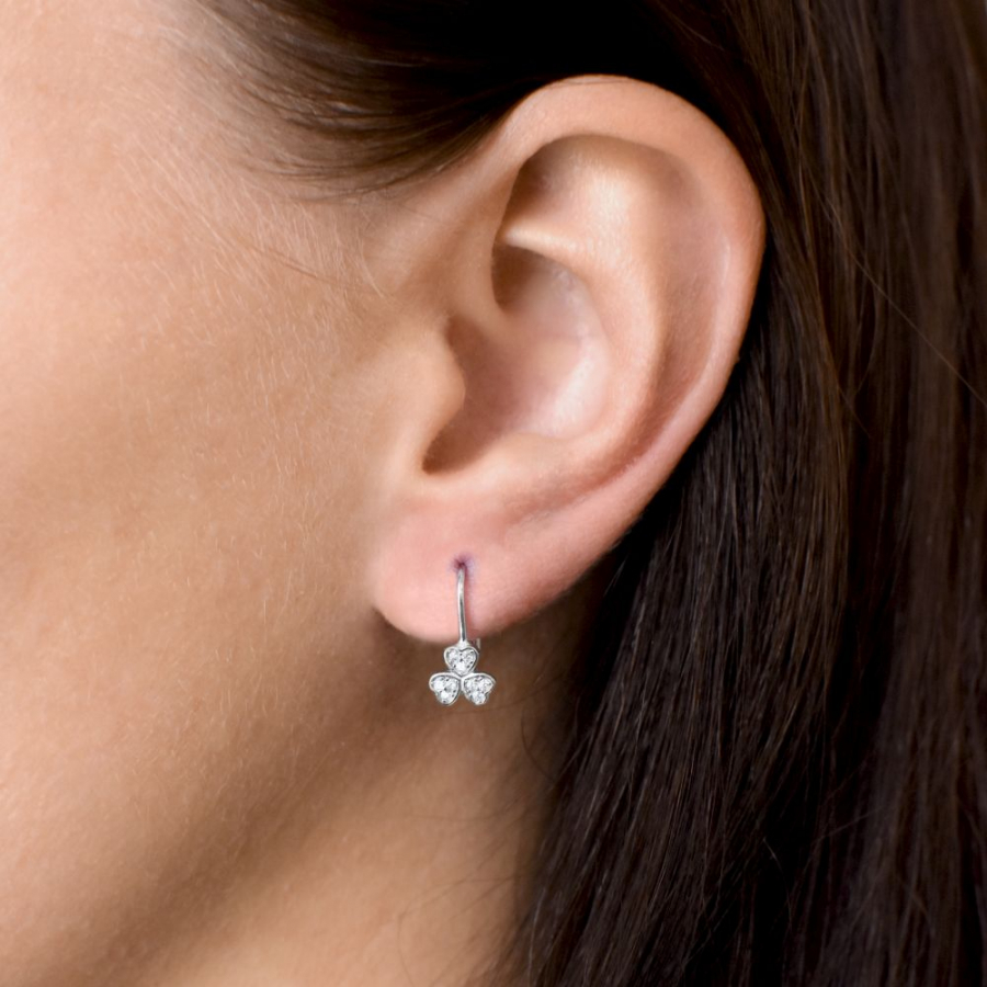 Zaujímavo riešené strieborné náušnice 11209.1 majú tvar trojlístkov tvorených z malých srdiečok vysadených trblietavými zirkónmi.