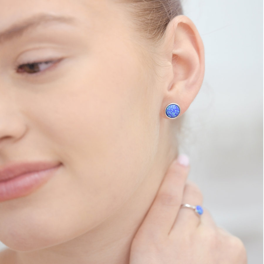 Jemné strieborné náušnice s modrým opálom potešia všetkých, ktorí milujú čistý dizajn s kvapkou neobyčajnosti. Náušnice majú tvar malých koliesok, ktoré sú osadené syntetickým modrým opálom – ten na dennom svetle hrá dúhovými odleskami v tónoch modrej, tyrkysovej, zelenej aj fialovej.